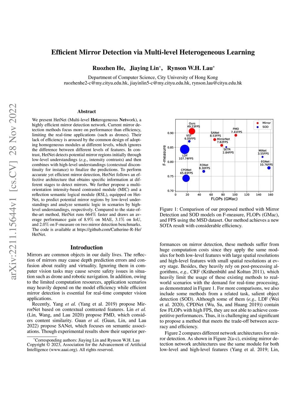 We present HetNet (Multi-level \textbf{Het}erogeneous \textbf{Net}work), a highly efficient mirror detection network. Current mirror detection methods focus more on performance than efficiency, limiting the real-time applications (such as drones). Their lack of efficiency is aroused by the common design of adopting homogeneous modules at different levels, which ignores the difference between different levels of features. In contrast, HetNet detects potential mirror regions initially through low-level understandings (\textit{e.g.}, intensity contrasts) and then combines with high-level understandings (contextual discontinuity for instance) to finalize the predictions. To perform accurate yet efficient mirror detection, HetNet follows an effective architecture that obtains specific information at different stages to detect mirrors. We further propose a multi-orientation intensity-based contrasted module (MIC) and a reflection semantic logical module (RSL), equipped on HetNet, to predict potential mirror regions by low-level understandings and analyze semantic logic in scenarios by high-level understandings, respectively. Compared to the state-of-the-art method, HetNet runs 664 faster and draws an average performance gain of 8.9 on MAE, 3.1 on IoU, and 2.0 on F-measure on two mirror detection benchmarks.