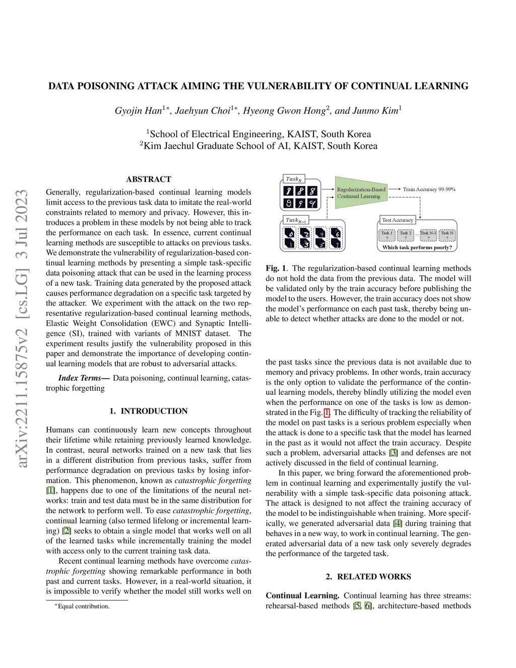 Generally, regularization-based continual learning models limit access to the previous task data to imitate the real-world constraints related to memory and privacy. However, this introduces a problem in these models by not being able to track the performance on each task. In essence, current continual learning methods are susceptible to attacks on previous tasks. We demonstrate the vulnerability of regularization-based continual learning methods by presenting a simple task-specific data poisoning attack that can be used in the learning process of a new task. Training data generated by the proposed attack causes performance degradation on a specific task targeted by the attacker. We experiment with the attack on the two representative regularization-based continual learning methods, Elastic Weight Consolidation (EWC) and Synaptic Intelligence (SI), trained with variants of MNIST dataset. The experiment results justify the vulnerability proposed in this paper and demonstrate the importance of developing continual learning models that are robust to adversarial attacks.