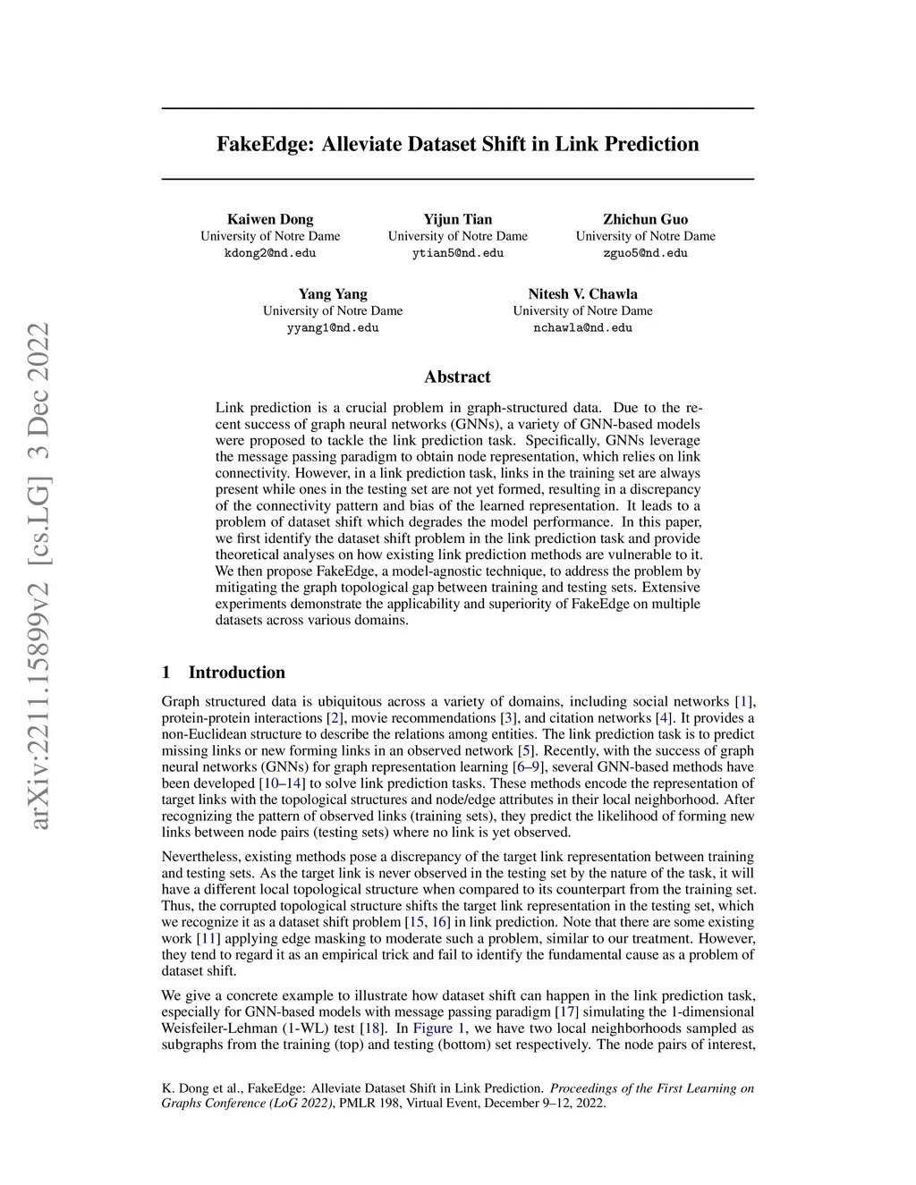Link prediction is a crucial problem in graph-structured data. Due to the recent success of graph neural networks (GNNs), a variety of GNN-based models were proposed to tackle the link prediction task. Specifically, GNNs leverage the message passing paradigm to obtain node representation, which relies on link connectivity. However, in a link prediction task, links in the training set are always present while ones in the testing set are not yet formed, resulting in a discrepancy of the connectivity pattern and bias of the learned representation. It leads to a problem of dataset shift which degrades the model performance. In this paper, we first identify the dataset shift problem in the link prediction task and provide theoretical analyses on how existing link prediction methods are vulnerable to it. We then propose FakeEdge, a model-agnostic technique, to address the problem by mitigating the graph topological gap between training and testing sets. Extensive experiments demonstrate the applicability and superiority of FakeEdge on multiple datasets across various domains.