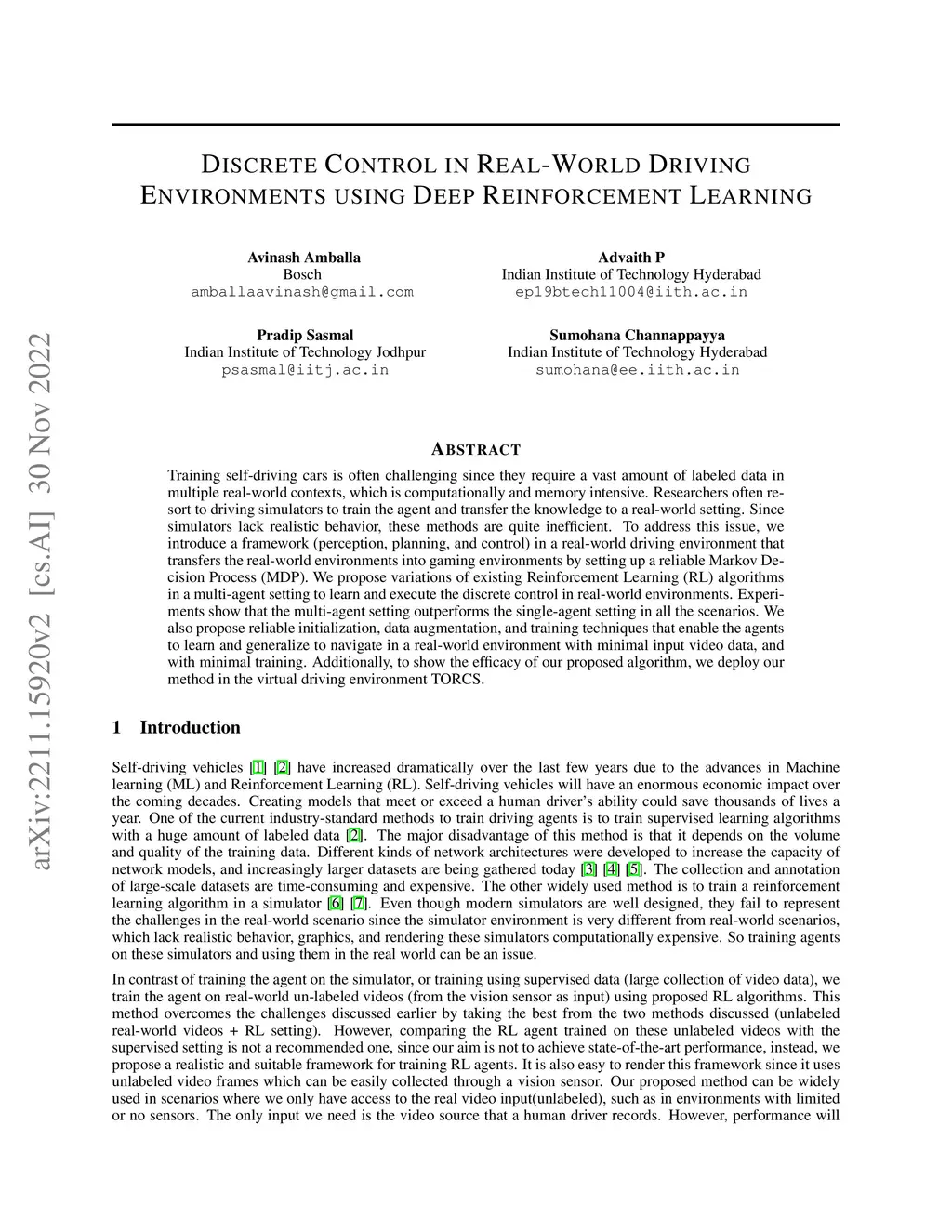 Training self-driving cars is often challenging since they require a vast amount of labeled data in multiple real-world contexts, which is computationally and memory intensive. Researchers often resort to driving simulators to train the agent and transfer the knowledge to a real-world setting. Since simulators lack realistic behavior, these methods are quite inefficient. To address this issue, we introduce a framework (perception, planning, and control) in a real-world driving environment that transfers the real-world environments into gaming environments by setting up a reliable Markov Decision Process (MDP). We propose variations of existing Reinforcement Learning (RL) algorithms in a multi-agent setting to learn and execute the discrete control in real-world environments. Experiments show that the multi-agent setting outperforms the single-agent setting in all the scenarios. We also propose reliable initialization, data augmentation, and training techniques that enable the agents to learn and generalize to navigate in a real-world environment with minimal input video data, and with minimal training. Additionally, to show the efficacy of our proposed algorithm, we deploy our method in the virtual driving environment TORCS.