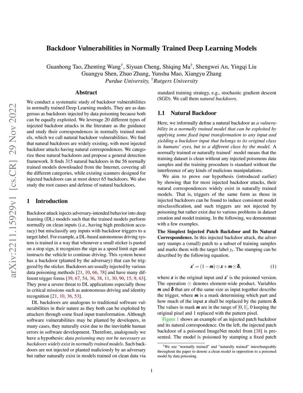 We conduct a systematic study of backdoor vulnerabilities in normally trained Deep Learning models. They are as dangerous as backdoors injected by data poisoning because both can be equally exploited. We leverage 20 different types of injected backdoor attacks in the literature as the guidance and study their correspondences in normally trained models, which we call natural backdoor vulnerabilities. We find that natural backdoors are widely existing, with most injected backdoor attacks having natural correspondences. We categorize these natural backdoors and propose a general detection framework. It finds 315 natural backdoors in the 56 normally trained models downloaded from the Internet, covering all the different categories, while existing scanners designed for injected backdoors can at most detect 65 backdoors. We also study the root causes and defense of natural backdoors.