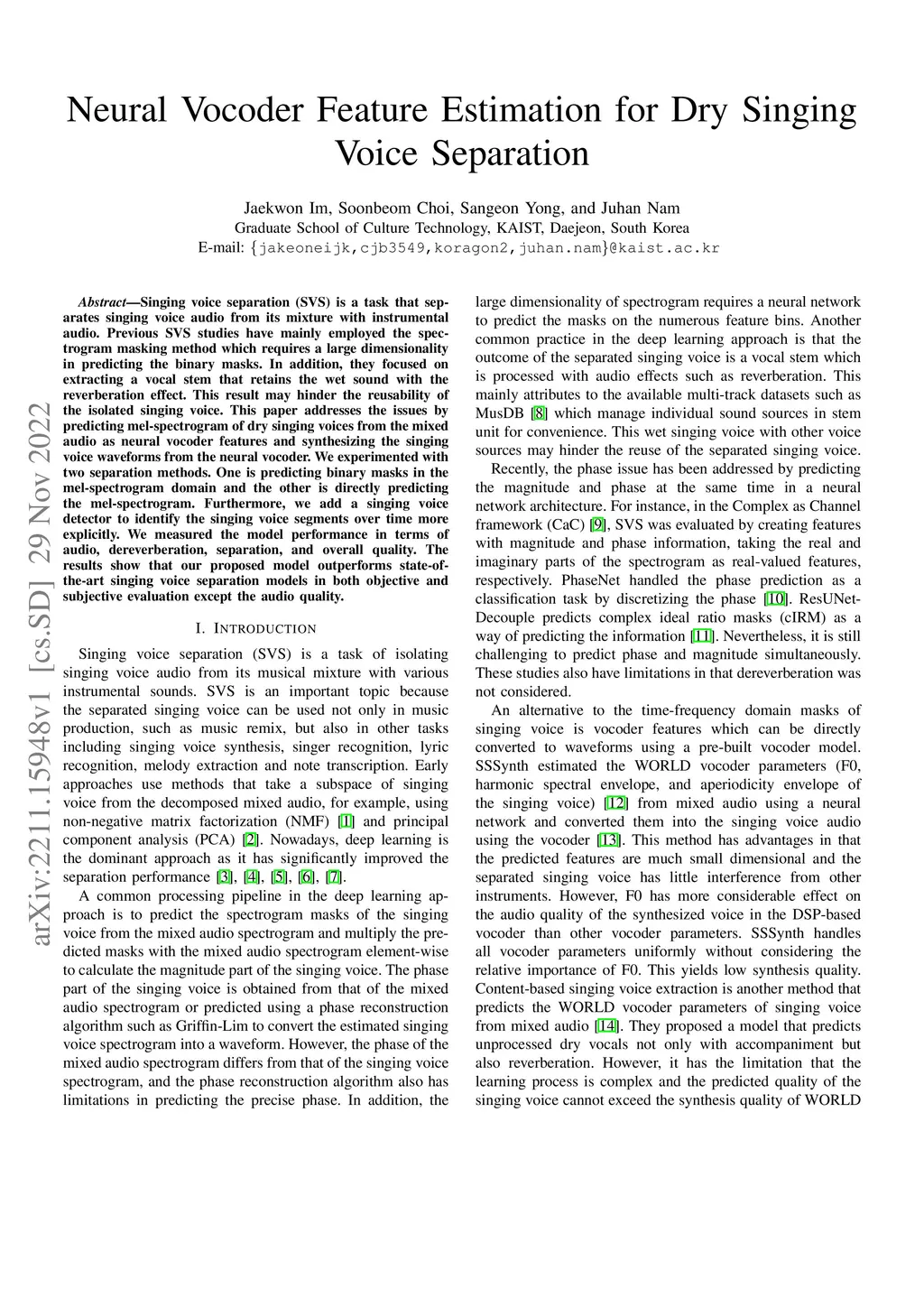 Neural Vocoder Feature Estimation for Dry Singing Voice Separation