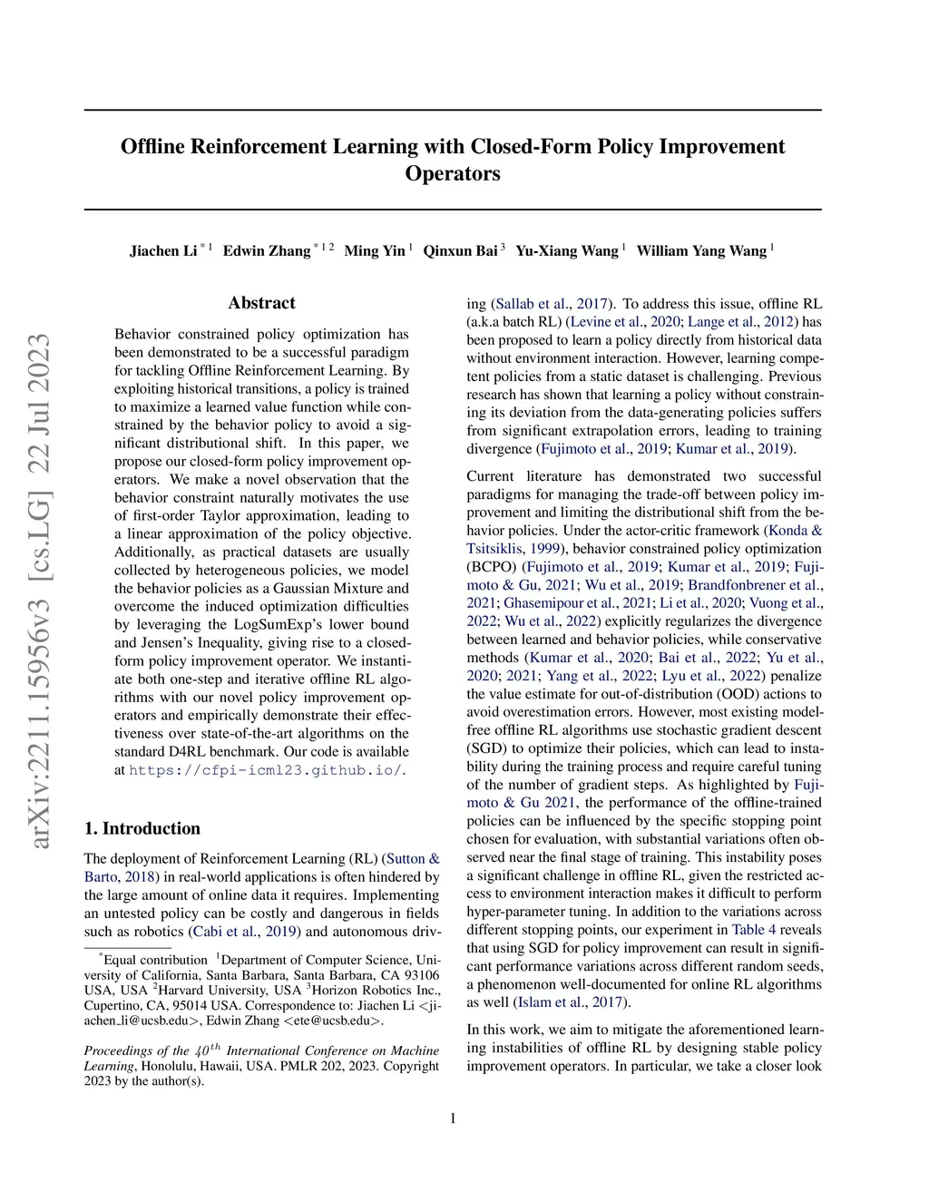Behavior constrained policy optimization has been demonstrated to be a successful paradigm for tackling Offline Reinforcement Learning. By exploiting historical transitions, a policy is trained to maximize a learned value function while constrained by the behavior policy to avoid a significant distributional shift. In this paper, we propose our closed-form policy improvement operators. We make a novel observation that the behavior constraint naturally motivates the use of first-order Taylor approximation, leading to a linear approximation of the policy objective. Additionally, as practical datasets are usually collected by heterogeneous policies, we model the behavior policies as a Gaussian Mixture and overcome the induced optimization difficulties by leveraging the LogSumExp's lower bound and Jensen's Inequality, giving rise to a closed-form policy improvement operator. We instantiate offline RL algorithms with our novel policy improvement operators and empirically demonstrate their effectiveness over state-of-the-art algorithms on the standard D4RL benchmark. Our code is available at https://cfpi-icml23.github.io/.