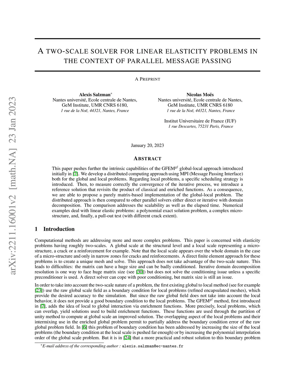 This paper pushes further the intrinsic capabilities of the GFEM global-local approach introduced initially in [1]. We develop a distributed computing approach using MPI (Message Passing Interface) both for the global and local problems. Regarding local problems, a specific scheduling strategy is introduced. Then, to measure correctly the convergence of the iterative process, we introduce a reference solution that revisits the product of classical and enriched functions. As a consequence, we are able to propose a purely matrix-based implementation of the global-local problem. The distributed approach is then compared to other parallel solvers either direct or iterative with domain decomposition. The comparison addresses the scalability as well as the elapsed time. Numerical examples deal with linear elastic problems: a polynomial exact solution problem, a complex micro-structure, and, finally, a pull-out test (with different crack extent). 1: C. A. Duarte, D.-J. Kim, and I. Babu\v{s}ka. A global-local approach for the construction of enrichment functions for the generalized fem and its application to three-dimensional cracks. In Advances in Meshfree Techniques, Dordrecht, 2007. Springer