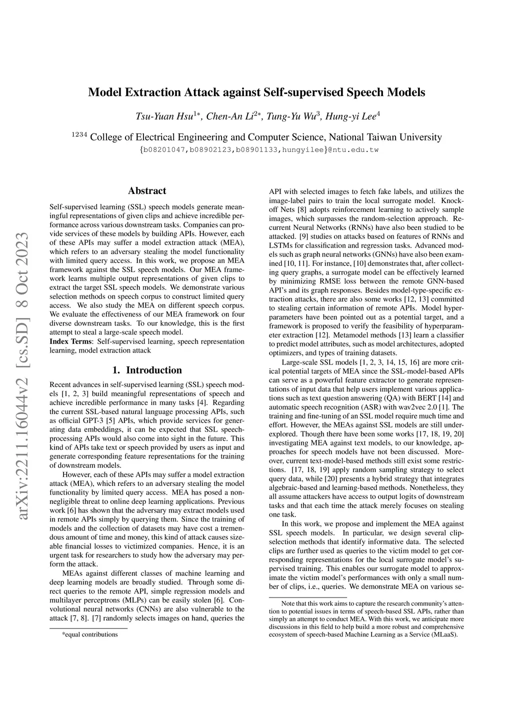 Self-supervised learning (SSL) speech models generate meaningful representations of given clips and achieve incredible performance across various downstream tasks. Model extraction attack (MEA) often refers to an adversary stealing the functionality of the victim model with only query access. In this work, we study the MEA problem against SSL speech model with a small number of queries. We propose a two-stage framework to extract the model. In the first stage, SSL is conducted on the large-scale unlabeled corpus to pre-train a small speech model. Secondly, we actively sample a small portion of clips from the unlabeled corpus and query the target model with these clips to acquire their representations as labels for the small model's second-stage training. Experiment results show that our sampling methods can effectively extract the target model without knowing any information about its model architecture.
