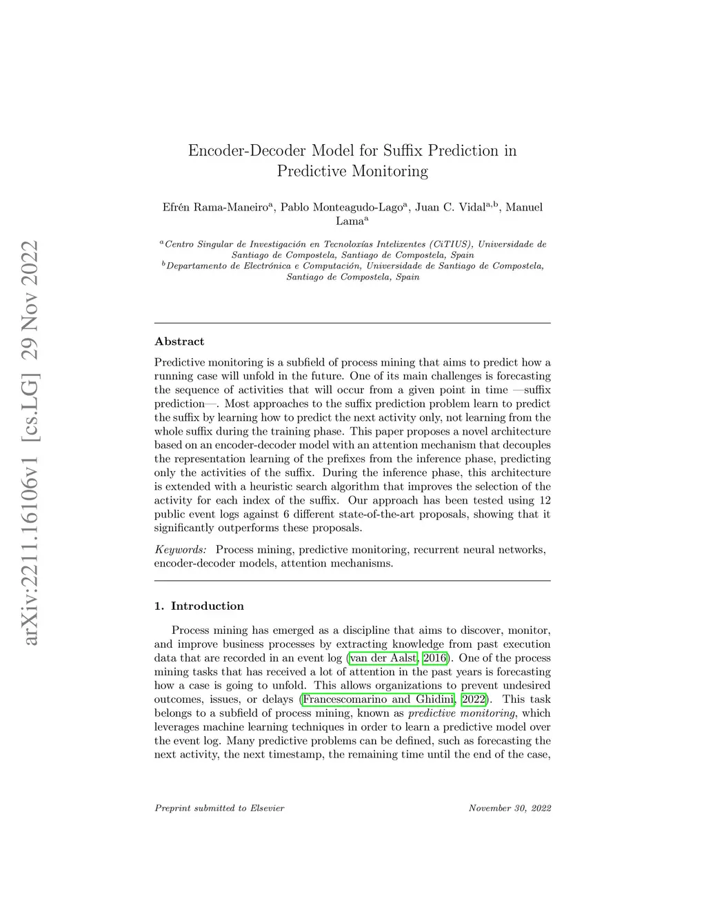 Predictive monitoring is a subfield of process mining that aims to predict how a running case will unfold in the future. One of its main challenges is forecasting the sequence of activities that will occur from a given point in time -- suffix prediction -- . Most approaches to the suffix prediction problem learn to predict the suffix by learning how to predict the next activity only, not learning from the whole suffix during the training phase. This paper proposes a novel architecture based on an encoder-decoder model with an attention mechanism that decouples the representation learning of the prefixes from the inference phase, predicting only the activities of the suffix. During the inference phase, this architecture is extended with a heuristic search algorithm that improves the selection of the activity for each index of the suffix. Our approach has been tested using 12 public event logs against 6 different state-of-the-art proposals, showing that it significantly outperforms these proposals.