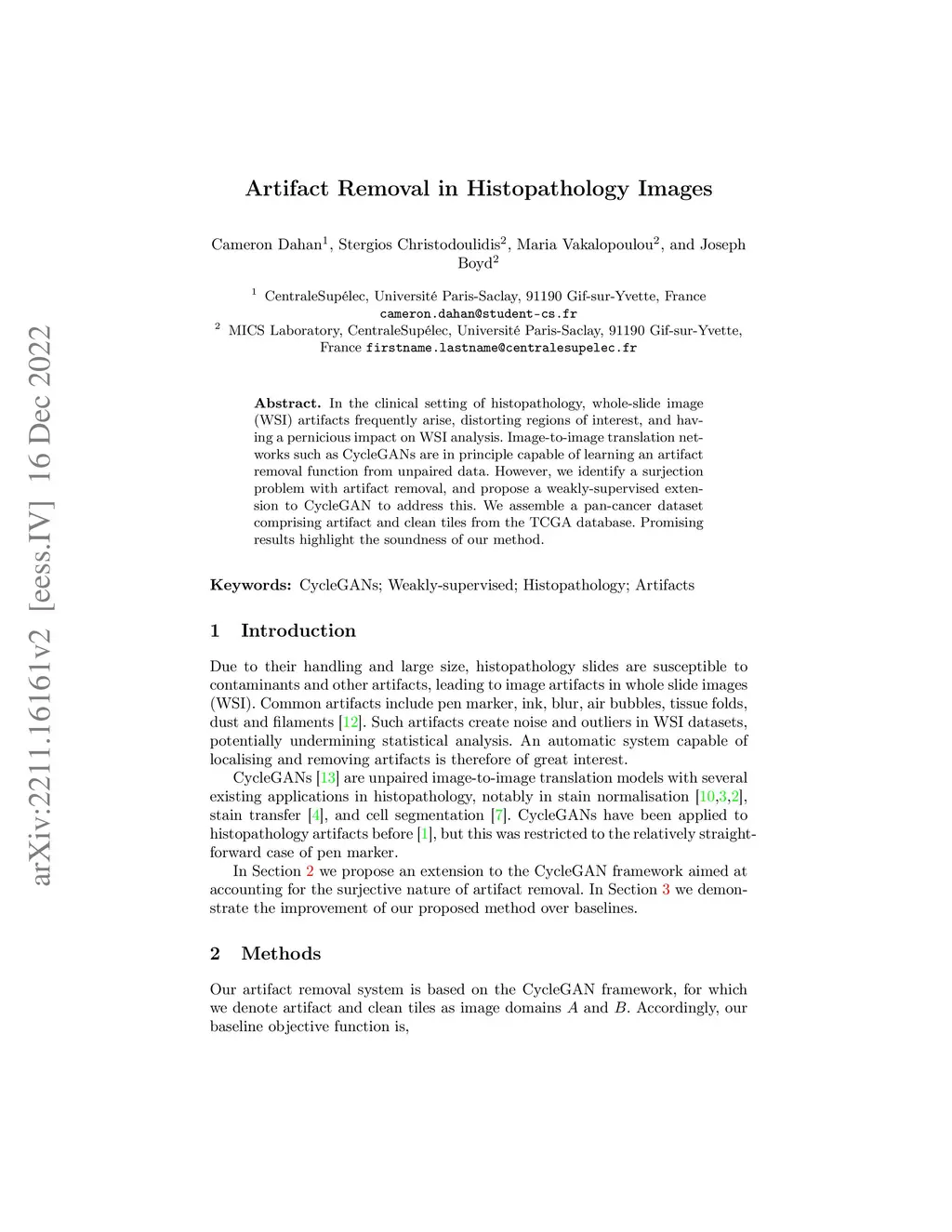 In the clinical setting of histopathology, whole-slide image (WSI) artifacts frequently arise, distorting regions of interest, and having a pernicious impact on WSI analysis. Image-to-image translation networks such as CycleGANs are in principle capable of learning an artifact removal function from unpaired data. However, we identify a surjection problem with artifact removal, and propose an weakly-supervised extension to CycleGAN to address this. We assemble a pan-cancer dataset comprising artifact and clean tiles from the TCGA database. Promising results highlight the soundness of our method.