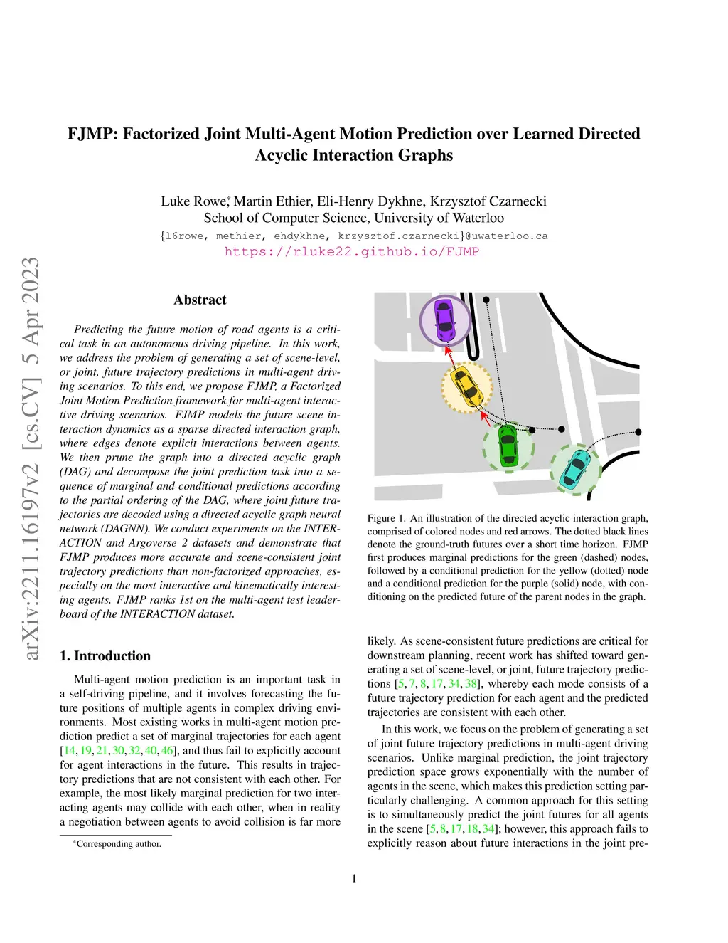 Predicting the future motion of road agents is a critical task in an autonomous driving pipeline. In this work, we address the problem of generating a set of scene-level, or joint, future trajectory predictions in multi-agent driving scenarios. To this end, we propose FJMP, a Factorized Joint Motion Prediction framework for multi-agent interactive driving scenarios. FJMP models the future scene interaction dynamics as a sparse directed interaction graph, where edges denote explicit interactions between agents. We then prune the graph into a directed acyclic graph (DAG) and decompose the joint prediction task into a sequence of marginal and conditional predictions according to the partial ordering of the DAG, where joint future trajectories are decoded using a directed acyclic graph neural network (DAGNN). We conduct experiments on the INTERACTION and Argoverse 2 datasets and demonstrate that FJMP produces more accurate and scene-consistent joint trajectory predictions than non-factorized approaches, especially on the most interactive and kinematically interesting agents. FJMP ranks 1st on the multi-agent test leaderboard of the INTERACTION dataset.