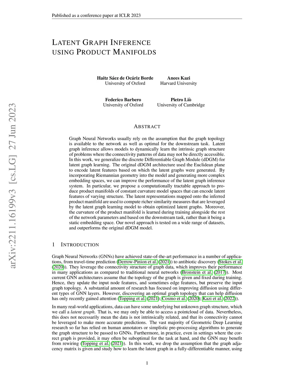 Graph Neural Networks usually rely on the assumption that the graph topology is available to the network as well as optimal for the downstream task. Latent graph inference allows models to dynamically learn the intrinsic graph structure of problems where the connectivity patterns of data may not be directly accessible. In this work, we generalize the discrete Differentiable Graph Module (dDGM) for latent graph learning. The original dDGM architecture used the Euclidean plane to encode latent features based on which the latent graphs were generated. By incorporating Riemannian geometry into the model and generating more complex embedding spaces, we can improve the performance of the latent graph inference system. In particular, we propose a computationally tractable approach to produce product manifolds of constant curvature model spaces that can encode latent features of varying structure. The latent representations mapped onto the inferred product manifold are used to compute richer similarity measures that are leveraged by the latent graph learning model to obtain optimized latent graphs. Moreover, the curvature of the product manifold is learned during training alongside the rest of the network parameters and based on the downstream task, rather than it being a static embedding space. Our novel approach is tested on a wide range of datasets, and outperforms the original dDGM model.
