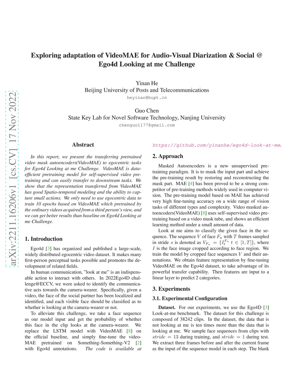 In this report, we present the transferring pretrained video mask autoencoders(VideoMAE) to egocentric tasks for Ego4d Looking at me Challenge. VideoMAE is the data-efficient pretraining model for self-supervised video pre-training and can easily transfer to downstream tasks. We show that the representation transferred from VideoMAE has good Spatio-temporal modeling and the ability to capture small actions. We only need to use egocentric data to train 10 epochs based on VideoMAE which pretrained by the ordinary videos acquired from a third person's view, and we can get better results than the baseline on Ego4d Looking at me Challenge.