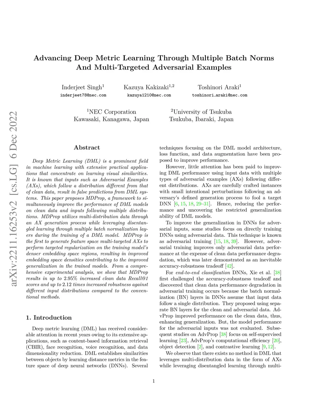 Deep Metric Learning (DML) is a prominent field in machine learning with extensive practical applications that concentrate on learning visual similarities. It is known that inputs such as Adversarial Examples (AXs), which follow a distribution different from that of clean data, result in false predictions from DML systems. This paper proposes MDProp, a framework to simultaneously improve the performance of DML models on clean data and inputs following multiple distributions. MDProp utilizes multi-distribution data through an AX generation process while leveraging disentangled learning through multiple batch normalization layers during the training of a DML model. MDProp is the first to generate feature space multi-targeted AXs to perform targeted regularization on the training model's denser embedding space regions, resulting in improved embedding space densities contributing to the improved generalization in the trained models. From a comprehensive experimental analysis, we show that MDProp results in up to 2.95% increased clean data Recall@1 scores and up to 2.12 times increased robustness against different input distributions compared to the conventional methods.