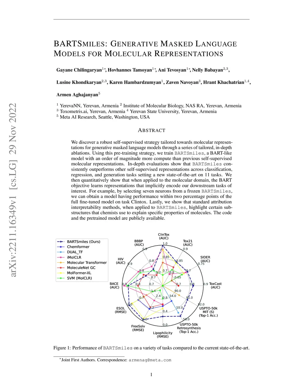 We discover a robust self-supervised strategy tailored towards molecular representations for generative masked language models through a series of tailored, in-depth ablations. Using this pre-training strategy, we train BARTSmiles, a BART-like model with an order of magnitude more compute than previous self-supervised molecular representations. In-depth evaluations show that BARTSmiles consistently outperforms other self-supervised representations across classification, regression, and generation tasks setting a new state-of-the-art on 11 tasks. We then quantitatively show that when applied to the molecular domain, the BART objective learns representations that implicitly encode our downstream tasks of interest. For example, by selecting seven neurons from a frozen BARTSmiles, we can obtain a model having performance within two percentage points of the full fine-tuned model on task Clintox. Lastly, we show that standard attribution interpretability methods, when applied to BARTSmiles, highlight certain substructures that chemists use to explain specific properties of molecules. The code and the pretrained model are publicly available.