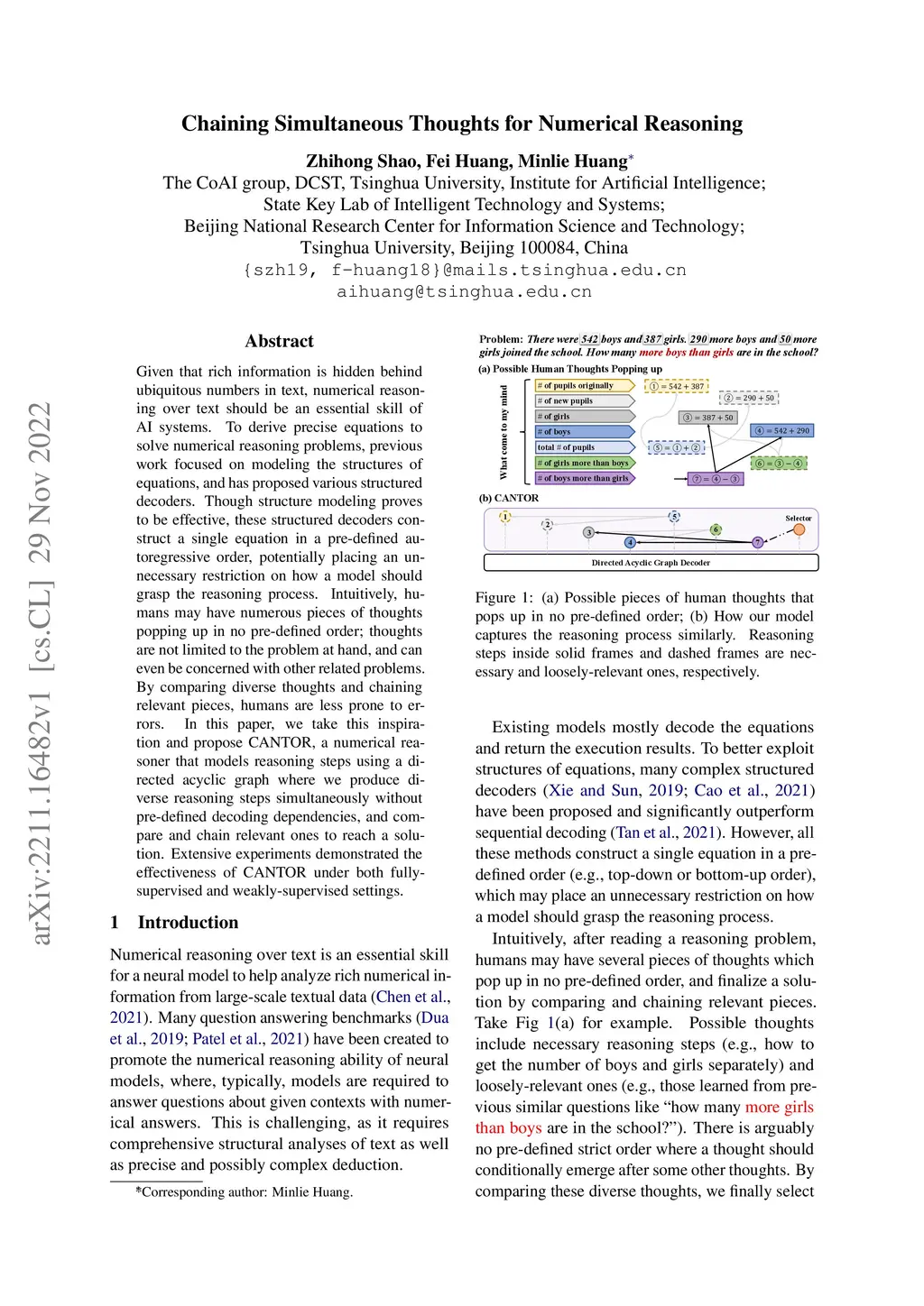 Given that rich information is hidden behind ubiquitous numbers in text, numerical reasoning over text should be an essential skill of AI systems. To derive precise equations to solve numerical reasoning problems, previous work focused on modeling the structures of equations, and has proposed various structured decoders. Though structure modeling proves to be effective, these structured decoders construct a single equation in a pre-defined autoregressive order, potentially placing an unnecessary restriction on how a model should grasp the reasoning process. Intuitively, humans may have numerous pieces of thoughts popping up in no pre-defined order; thoughts are not limited to the problem at hand, and can even be concerned with other related problems. By comparing diverse thoughts and chaining relevant pieces, humans are less prone to errors. In this paper, we take this inspiration and propose CANTOR, a numerical reasoner that models reasoning steps using a directed acyclic graph where we produce diverse reasoning steps simultaneously without pre-defined decoding dependencies, and compare and chain relevant ones to reach a solution. Extensive experiments demonstrated the effectiveness of CANTOR under both fully-supervised and weakly-supervised settings.