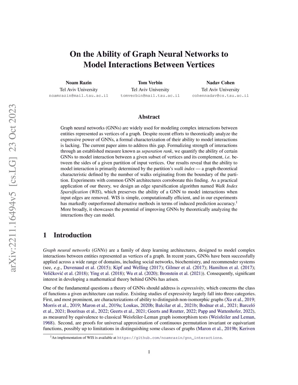 Graph neural networks (GNNs) are widely used for modeling complex interactions between entities represented as vertices of a graph. Despite recent efforts to theoretically analyze the expressive power of GNNs, a formal characterization of their ability to model interactions is lacking. The current paper aims to address this gap. Formalizing strength of interactions through an established measure known as separation rank, we quantify the ability of certain GNNs to model interaction between a given subset of vertices and its complement, i.e. between the sides of a given partition of input vertices. Our results reveal that the ability to model interaction is primarily determined by the partition's walk index -- a graph-theoretical characteristic defined by the number of walks originating from the boundary of the partition. Experiments with common GNN architectures corroborate this finding. As a practical application of our theory, we design an edge sparsification algorithm named Walk Index Sparsification (WIS), which preserves the ability of a GNN to model interactions when input edges are removed. WIS is simple, computationally efficient, and in our experiments has markedly outperformed alternative methods in terms of induced prediction accuracy. More broadly, it showcases the potential of improving GNNs by theoretically analyzing the interactions they can model.