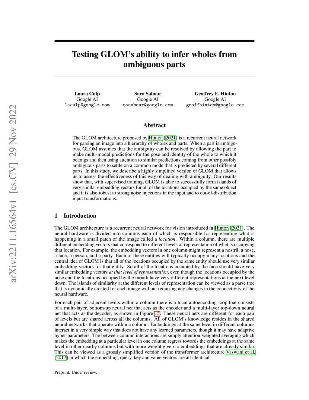 The GLOM architecture proposed by Hinton [2021] is a recurrent neural network for parsing an image into a hierarchy of wholes and parts. When a part is ambiguous, GLOM assumes that the ambiguity can be resolved by allowing the part to make multi-modal predictions for the pose and identity of the whole to which it belongs and then using attention to similar predictions coming from other possibly ambiguous parts to settle on a common mode that is predicted by several different parts. In this study, we describe a highly simplified version of GLOM that allows us to assess the effectiveness of this way of dealing with ambiguity. Our results show that, with supervised training, GLOM is able to successfully form islands of very similar embedding vectors for all of the locations occupied by the same object and it is also robust to strong noise injections in the input and to out-of-distribution input transformations.