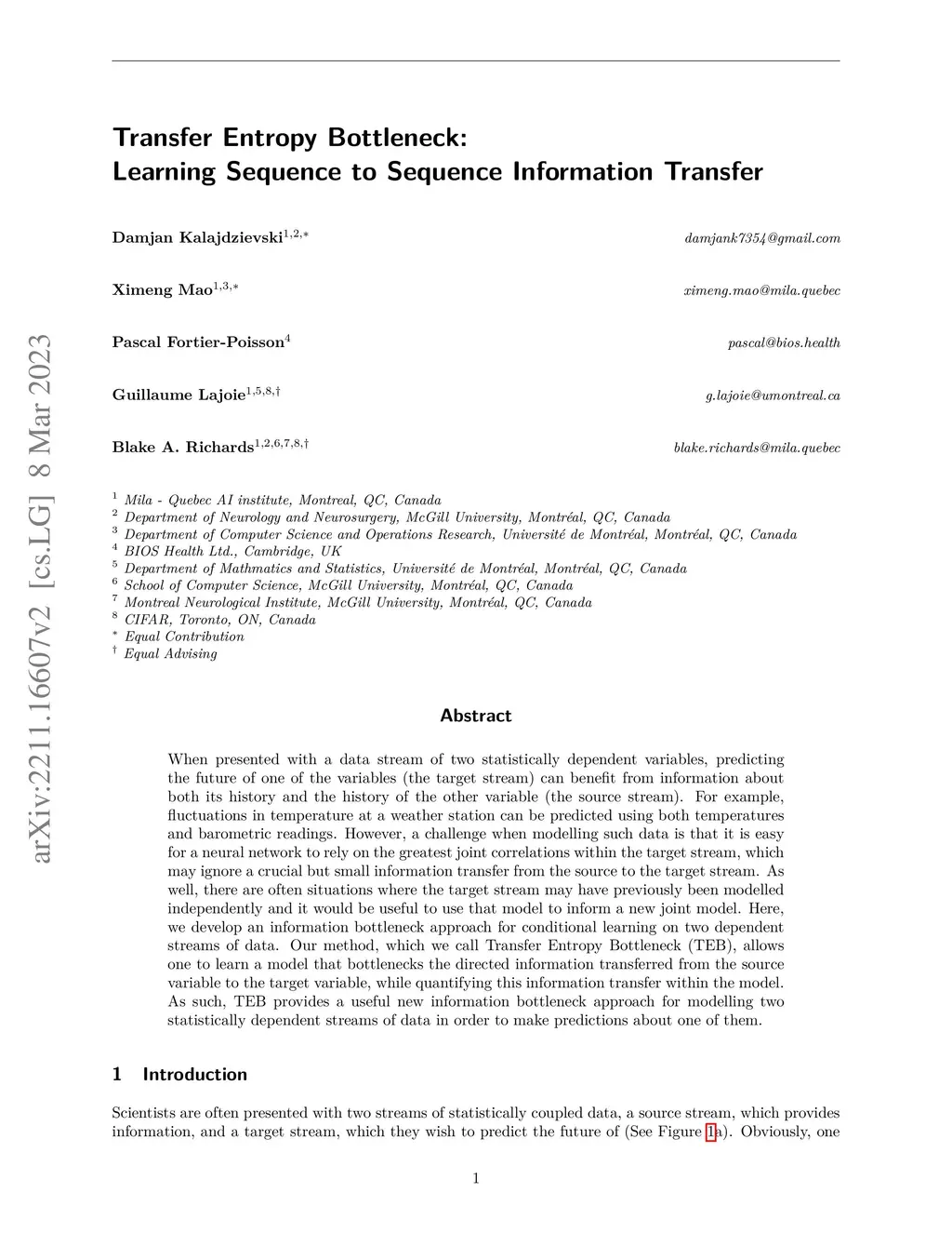 When presented with a data stream of two statistically dependent variables, predicting the future of one of the variables (the target stream) can benefit from information about both its history and the history of the other variable (the source stream). For example, fluctuations in temperature at a weather station can be predicted using both temperatures and barometric readings. However, a challenge when modelling such data is that it is easy for a neural network to rely on the greatest joint correlations within the target stream, which may ignore a crucial but small information transfer from the source to the target stream. As well, there are often situations where the target stream may have previously been modelled independently and it would be useful to use that model to inform a new joint model. Here, we develop an information bottleneck approach for conditional learning on two dependent streams of data. Our method, which we call Transfer Entropy Bottleneck (TEB), allows one to learn a model that bottlenecks the directed information transferred from the source variable to the target variable, while quantifying this information transfer within the model. As such, TEB provides a useful new information bottleneck approach for modelling two statistically dependent streams of data in order to make predictions about one of them.