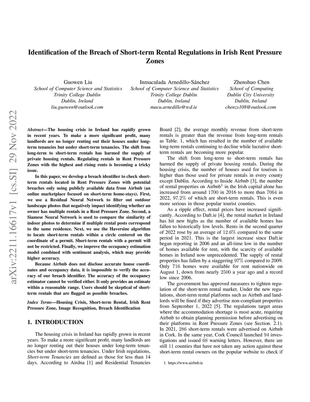 The housing crisis in Ireland has rapidly grown in recent years. To make a more significant profit, many landlords are no longer renting out their houses under long-term tenancies but under short-term tenancies. The shift from long-term to short-term rentals has harmed the supply of private housing rentals. Regulating rentals in Rent Pressure Zones with the highest and rising rents is becoming a tricky issue. In this paper, we develop a breach identifier to check short-term rentals located in Rent Pressure Zones with potential breaches only using publicly available data from Airbnb (an online marketplace focused on short-term home-stays). First, we use a Residual Neural Network to filter out outdoor landscape photos that negatively impact identifying whether an owner has multiple rentals in a Rent Pressure Zone. Second, a Siamese Neural Network is used to compare the similarity of indoor photos to determine if multiple rental posts correspond to the same residence. Next, we use the Haversine algorithm to locate short-term rentals within a circle centered on the coordinate of a permit. Short-term rentals with a permit will not be restricted. Finally, we improve the occupancy estimation model combined with sentiment analysis, which may provide higher accuracy. Because Airbnb does not disclose accurate house coordinates and occupancy data, it is impossible to verify the accuracy of our breach identifier. The accuracy of the occupancy estimator cannot be verified either. It only provides an estimate within a reasonable range. Users should be skeptical of short-term rentals that are flagged as possible breaches.