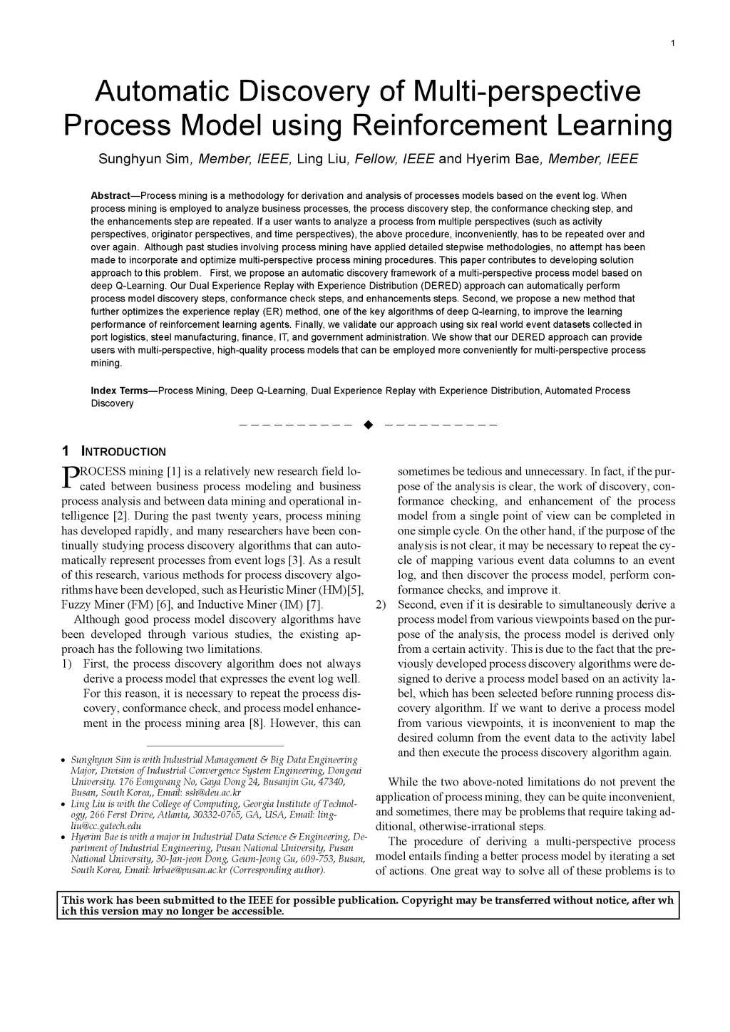 Process mining is a methodology for the derivation and analysis of process models based on the event log. When process mining is employed to analyze business processes, the process discovery step, the conformance checking step, and the enhancements step are repeated. If a user wants to analyze a process from multiple perspectives (such as activity perspectives, originator perspectives, and time perspectives), the above procedure, inconveniently, has to be repeated over and over again. Although past studies involving process mining have applied detailed stepwise methodologies, no attempt has been made to incorporate and optimize multi-perspective process mining procedures. This paper contributes to developing a solution approach to this problem. First, we propose an automatic discovery framework of a multi-perspective process model based on deep Q-Learning. Our Dual Experience Replay with Experience Distribution (DERED) approach can automatically perform process model discovery steps, conformance check steps, and enhancements steps. Second, we propose a new method that further optimizes the experience replay (ER) method, one of the key algorithms of deep Q-learning, to improve the learning performance of reinforcement learning agents. Finally, we validate our approach using six real-world event datasets collected in port logistics, steel manufacturing, finance, IT, and government administration. We show that our DERED approach can provide users with multi-perspective, high-quality process models that can be employed more conveniently for multi-perspective process mining.