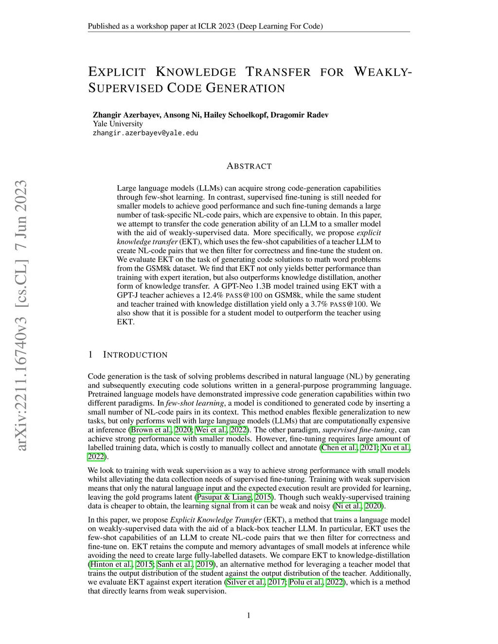 Large language models (LLMs) can acquire strong code-generation capabilities through few-shot learning. In contrast, supervised fine-tuning is still needed for smaller models to achieve good performance. Such fine-tuning demands a large number of task-specific NL-code pairs, which are expensive to obtain. In this paper, we attempt to transfer the code generation ability of an LLM to a smaller model with the aid of weakly-supervised data. More specifically, we propose explicit knowledge transfer (EKT), which uses the few-shot capabilities of a teacher LLM to create NL-code pairs that we then filter for correctness and fine-tune the student on. We evaluate EKT on the task of generating code solutions to math word problems from the GSM8k dataset. We find that EKT not only yields better performance than training with expert iteration, but also outperforms knowledge distillation, another form of knowledge transfer. A GPT-Neo 1.3B model trained using EKT with a GPT-J teacher achieves a 12.4% pass@100 on GSM8k, while the same student and teacher trained with knowledge distillation yield only a 3.7% pass@100. We also show that it is possible for a student model to outperform the teacher using EKT.