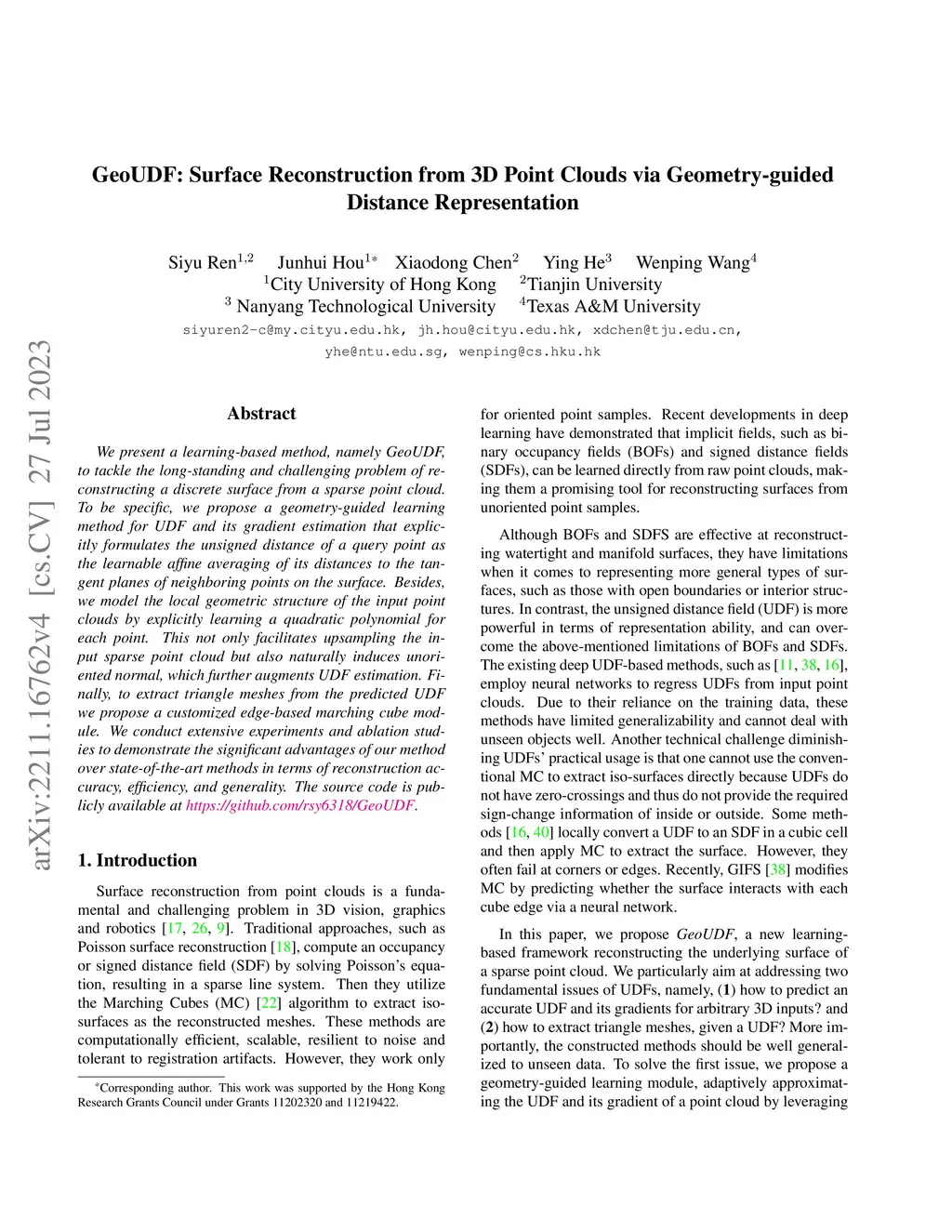 GeoUDF: Surface Reconstruction from 3D Point Clouds via Geometry-guided