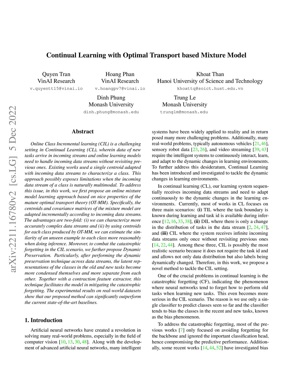 Online Class Incremental learning (CIL) is a challenging setting in Continual Learning (CL), wherein data of new tasks arrive in incoming streams and online learning models need to handle incoming data streams without revisiting previous ones. Existing works used a single centroid adapted with incoming data streams to characterize a class. This approach possibly exposes limitations when the incoming data stream of a class is naturally multimodal. To address this issue, in this work, we first propose an online mixture model learning approach based on nice properties of the mature optimal transport theory (OT-MM). Specifically, the centroids and covariance matrices of the mixture model are adapted incrementally according to incoming data streams. The advantages are two-fold: (i) we can characterize more accurately complex data streams and (ii) by using centroids for each class produced by OT-MM, we can estimate the similarity of an unseen example to each class more reasonably when doing inference. Moreover, to combat the catastrophic forgetting in the CIL scenario, we further propose Dynamic Preservation. Particularly, after performing the dynamic preservation technique across data streams, the latent representations of the classes in the old and new tasks become more condensed themselves and more separate from each other. Together with a contraction feature extractor, this technique facilitates the model in mitigating the catastrophic forgetting. The experimental results on real-world datasets show that our proposed method can significantly outperform the current state-of-the-art baselines.