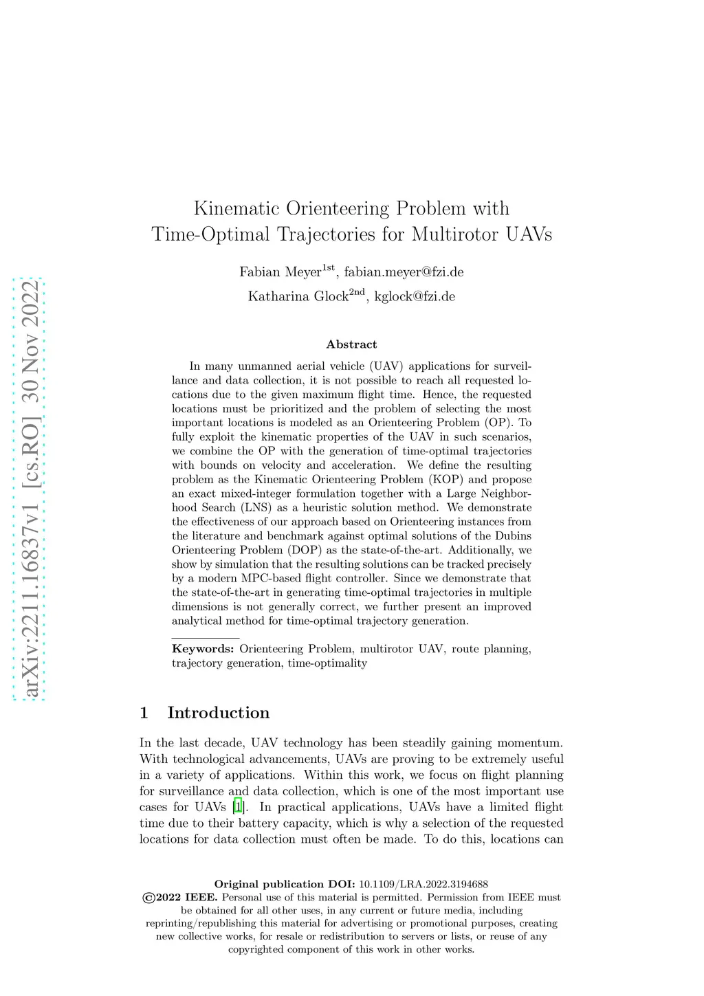 In many unmanned aerial vehicle (UAV) applications for surveillance and data collection, it is not possible to reach all requested locations due to the given maximum flight time. Hence, the requested locations must be prioritized and the problem of selecting the most important locations is modeled as an Orienteering Problem (OP). To fully exploit the kinematic properties of the UAV in such scenarios, we combine the OP with the generation of time-optimal trajectories with bounds on velocity and acceleration. We define the resulting problem as the Kinematic Orienteering Problem (KOP) and propose an exact mixed-integer formulation together with a Large Neighborhood Search (LNS) as a heuristic solution method. We demonstrate the effectiveness of our approach based on Orienteering instances from the literature and benchmark against optimal solutions of the Dubins Orienteering Problem (DOP) as the state-of-the-art. Additionally, we show by simulation \color{black} that the resulting solutions can be tracked precisely by a modern MPC-based flight controller. Since we demonstrate that the state-of-the-art in generating time-optimal trajectories in multiple dimensions is not generally correct, we further present an improved analytical method for time-optimal trajectory generation.