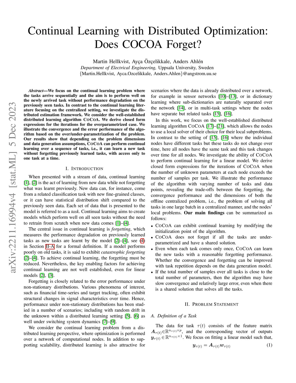 We focus on the continual learning problem where the tasks arrive sequentially and the aim is to perform well on the newly arrived task without performance degradation on the previously seen tasks. In contrast to the continual learning literature focusing on the centralized setting, we investigate the distributed estimation framework. We consider the well-established distributed learning algorithm COCOA. We derive closed form expressions for the iterations for the overparametrized case. We illustrate the convergence and the error performance of the algorithm based on the over/under-parameterization of the problem. Our results show that depending on the problem dimensions and data generation assumptions, COCOA can perform continual learning over a sequence of tasks, i.e., it can learn a new task without forgetting previously learned tasks, with access only to one task at a time.