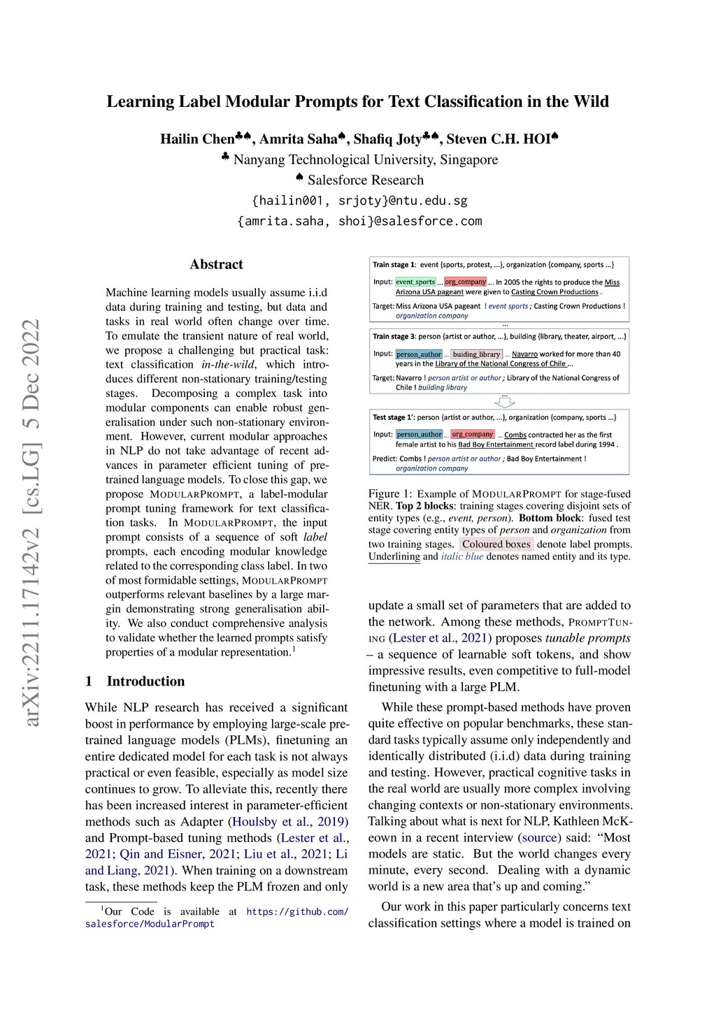 Machine learning models usually assume i.i.d data during training and testing, but data and tasks in real world often change over time. To emulate the transient nature of real world, we propose a challenging but practical task: text classification in-the-wild, which introduces different non-stationary training/testing stages. Decomposing a complex task into modular components can enable robust generalisation under such non-stationary environment. However, current modular approaches in NLP do not take advantage of recent advances in parameter efficient tuning of pretrained language models. To close this gap, we propose MODULARPROMPT, a label-modular prompt tuning framework for text classification tasks. In MODULARPROMPT, the input prompt consists of a sequence of soft label prompts, each encoding modular knowledge related to the corresponding class label. In two of most formidable settings, MODULARPROMPT outperforms relevant baselines by a large margin demonstrating strong generalisation ability. We also conduct comprehensive analysis to validate whether the learned prompts satisfy properties of a modular representation.