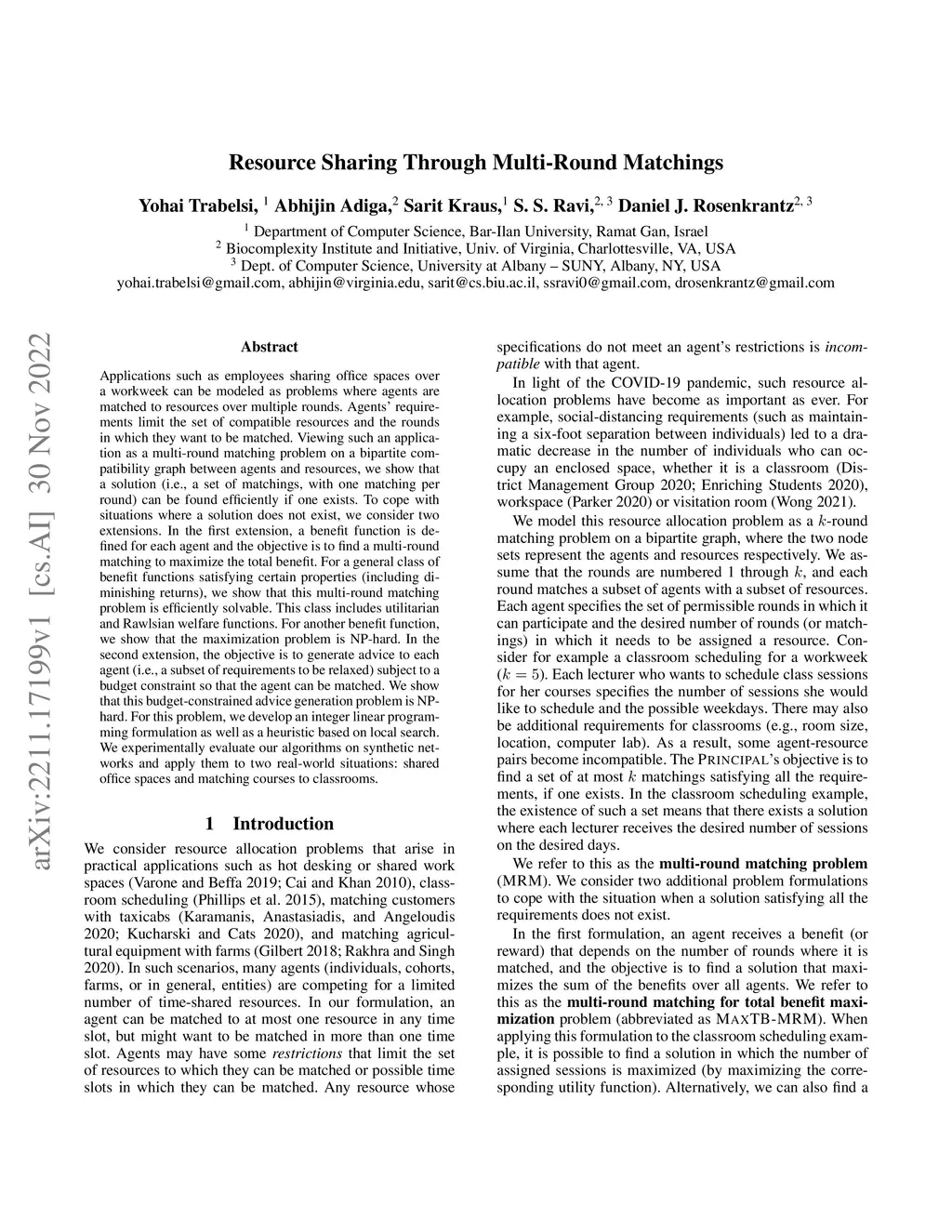 Applications such as employees sharing office spaces over a workweek can be modeled as problems where agents are matched to resources over multiple rounds. Agents' requirements limit the set of compatible resources and the rounds in which they want to be matched. Viewing such an application as a multi-round matching problem on a bipartite compatibility graph between agents and resources, we show that a solution (i.e., a set of matchings, with one matching per round) can be found efficiently if one exists. To cope with situations where a solution does not exist, we consider two extensions. In the first extension, a benefit function is defined for each agent and the objective is to find a multi-round matching to maximize the total benefit. For a general class of benefit functions satisfying certain properties (including diminishing returns), we show that this multi-round matching problem is efficiently solvable. This class includes utilitarian and Rawlsian welfare functions. For another benefit function, we show that the maximization problem is NP-hard. In the second extension, the objective is to generate advice to each agent (i.e., a subset of requirements to be relaxed) subject to a budget constraint so that the agent can be matched. We show that this budget-constrained advice generation problem is NP-hard. For this problem, we develop an integer linear programming formulation as well as a heuristic based on local search. We experimentally evaluate our algorithms on synthetic networks and apply them to two real-world situations: shared office spaces and matching courses to classrooms.
