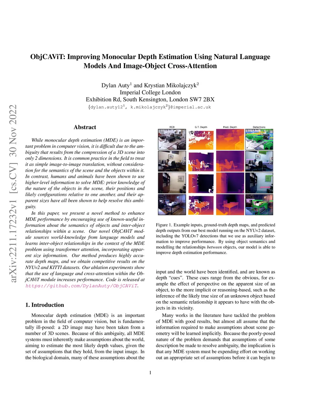 ObjCAViT: Improving Monocular Depth Estimation Using Natural Language