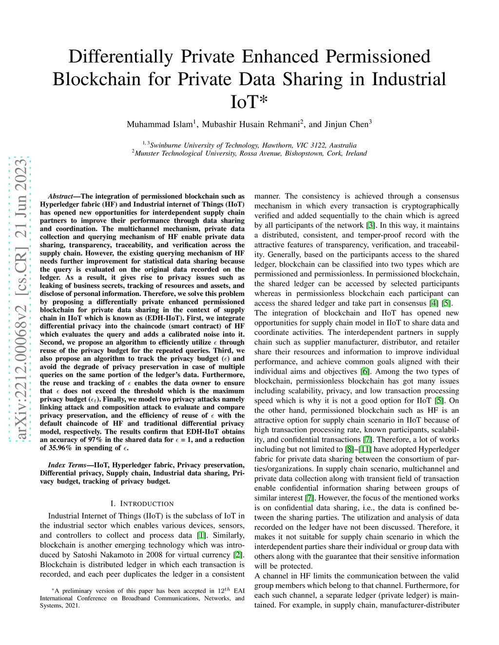 The integration of permissioned blockchain such as Hyperledger fabric (HF) and Industrial internet of Things (IIoT) has opened new opportunities for interdependent supply chain partners to improve their performance through data sharing and coordination. The multichannel mechanism, private data collection and querying mechanism of HF enable private data sharing, transparency, traceability, and verification across the supply chain. However, the existing querying mechanism of HF needs further improvement for statistical data sharing because the query is evaluated on the original data recorded on the ledger. As a result, it gives rise to privacy issues such as leak of business secrets, tracking of resources and assets, and disclose of personal information. Therefore, we solve this problem by proposing a differentially private enhanced permissioned blockchain for private data sharing in the context of supply chain in IIoT which is known as (EDH-IIoT). We propose algorithms to efficiently utilize the through the reuse of the privacy budget for the repeated queries. Furthermore, the reuse and tracking of enable the data owner to get ensure that does not exceed the threshold which is the maximum privacy budget (). Finally, we model two privacy attacks namely linking attack and composition attack to evaluate and compare privacy preservation, and the efficiency of reuse of {\epsilon} with the default chaincode of HF and traditional differential privacy model, respectively. The results confirm that EDH-IIoT obtains an accuracy of 97% in the shared data for = 1, and a reduction of 35.96% in spending of .