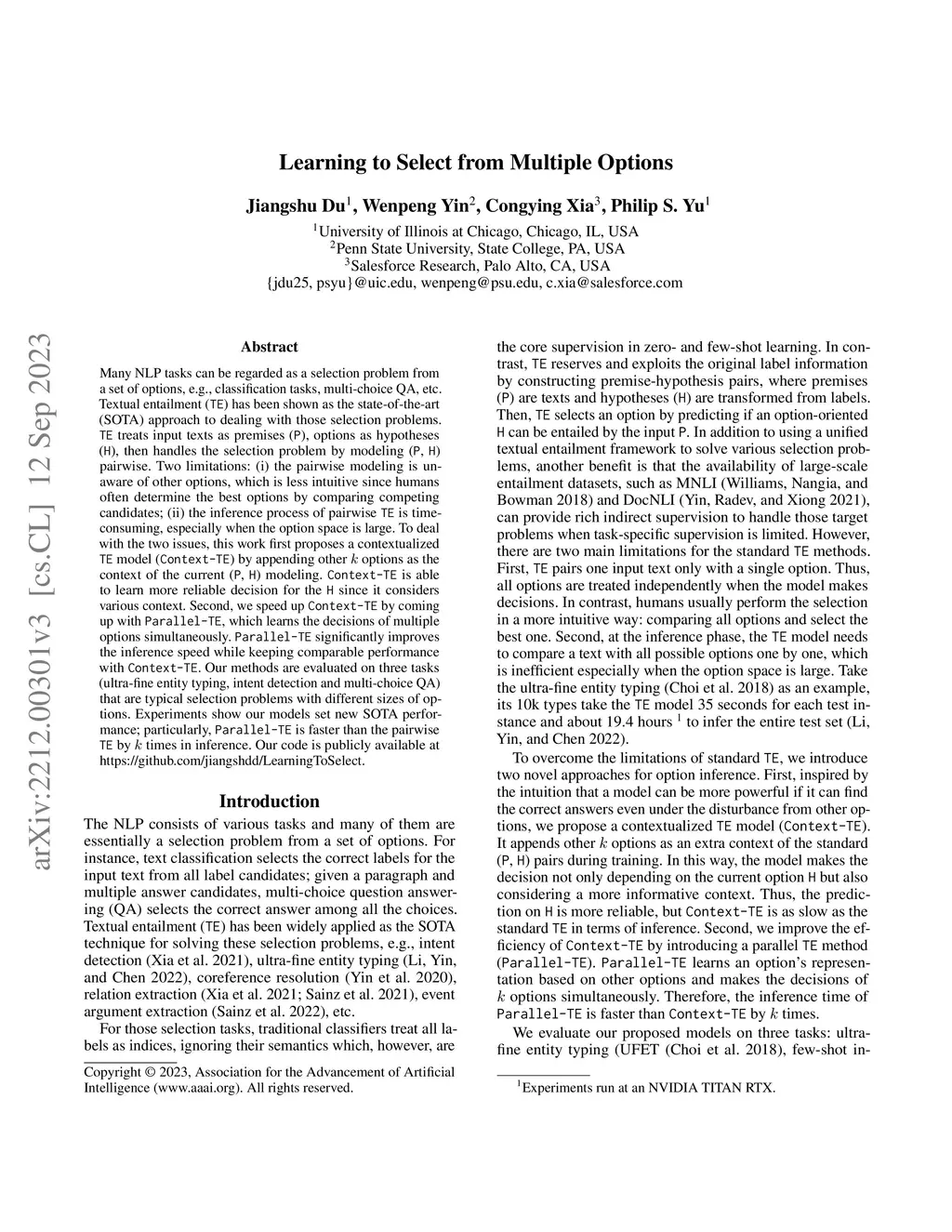 Many NLP tasks can be regarded as a selection problem from a set of options, such as classification tasks, multi-choice question answering, etc. Textual entailment (TE) has been shown as the state-of-the-art (SOTA) approach to dealing with those selection problems. TE treats input texts as premises (P), options as hypotheses (H), then handles the selection problem by modeling (P, H) pairwise. Two limitations: first, the pairwise modeling is unaware of other options, which is less intuitive since humans often determine the best options by comparing competing candidates; second, the inference process of pairwise TE is time-consuming, especially when the option space is large. To deal with the two issues, this work first proposes a contextualized TE model (Context-TE) by appending other k options as the context of the current (P, H) modeling. Context-TE is able to learn more reliable decision for the H since it considers various context. Second, we speed up Context-TE by coming up with Parallel-TE, which learns the decisions of multiple options simultaneously. Parallel-TE significantly improves the inference speed while keeping comparable performance with Context-TE. Our methods are evaluated on three tasks (ultra-fine entity typing, intent detection and multi-choice QA) that are typical selection problems with different sizes of options. Experiments show our models set new SOTA performance; particularly, Parallel-TE is faster than the pairwise TE by k times in inference. Our code is publicly available at https://github.com/jiangshdd/LearningToSelect.