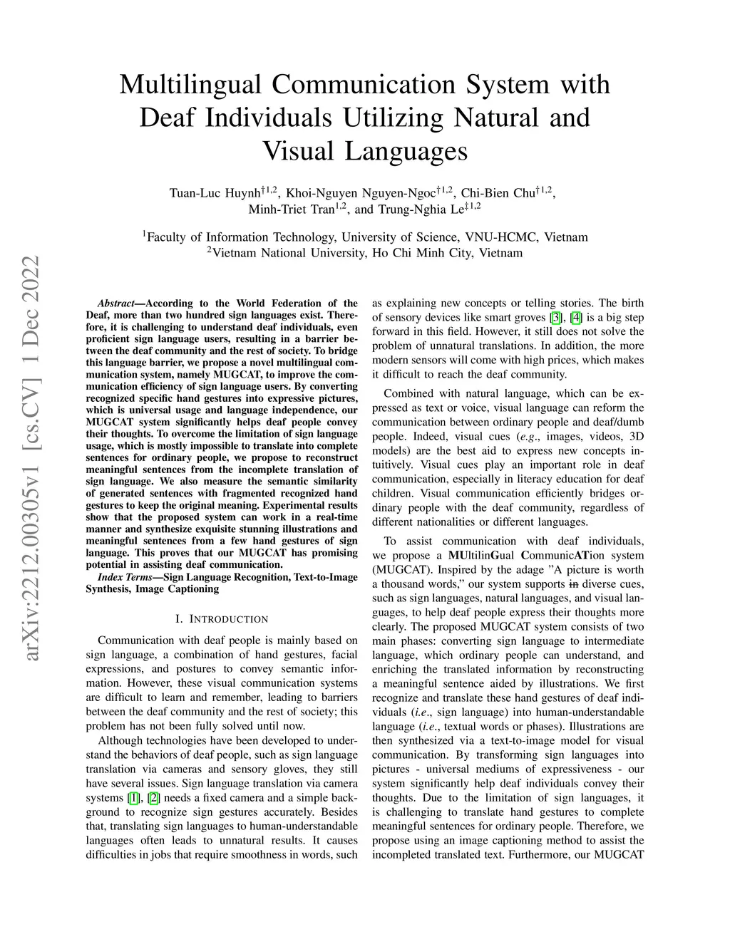 According to the World Federation of the Deaf, more than two hundred sign languages exist. Therefore, it is challenging to understand deaf individuals, even proficient sign language users, resulting in a barrier between the deaf community and the rest of society. To bridge this language barrier, we propose a novel multilingual communication system, namely MUGCAT, to improve the communication efficiency of sign language users. By converting recognized specific hand gestures into expressive pictures, which is universal usage and language independence, our MUGCAT system significantly helps deaf people convey their thoughts. To overcome the limitation of sign language usage, which is mostly impossible to translate into complete sentences for ordinary people, we propose to reconstruct meaningful sentences from the incomplete translation of sign language. We also measure the semantic similarity of generated sentences with fragmented recognized hand gestures to keep the original meaning. Experimental results show that the proposed system can work in a real-time manner and synthesize exquisite stunning illustrations and meaningful sentences from a few hand gestures of sign language. This proves that our MUGCAT has promising potential in assisting deaf communication.