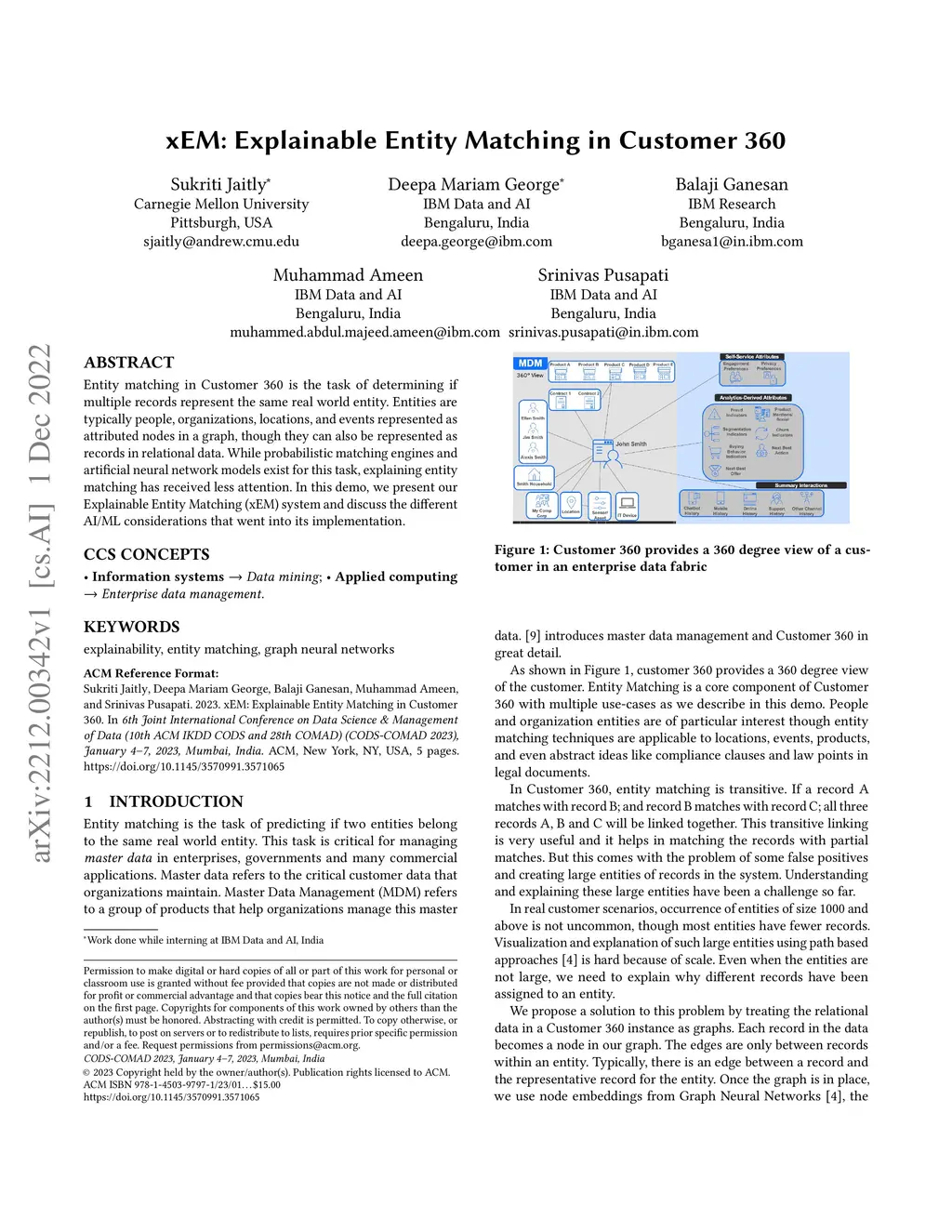Entity matching in Customer 360 is the task of determining if multiple records represent the same real world entity. Entities are typically people, organizations, locations, and events represented as attributed nodes in a graph, though they can also be represented as records in relational data. While probabilistic matching engines and artificial neural network models exist for this task, explaining entity matching has received less attention. In this demo, we present our Explainable Entity Matching (xEM) system and discuss the different AI/ML considerations that went into its implementation.