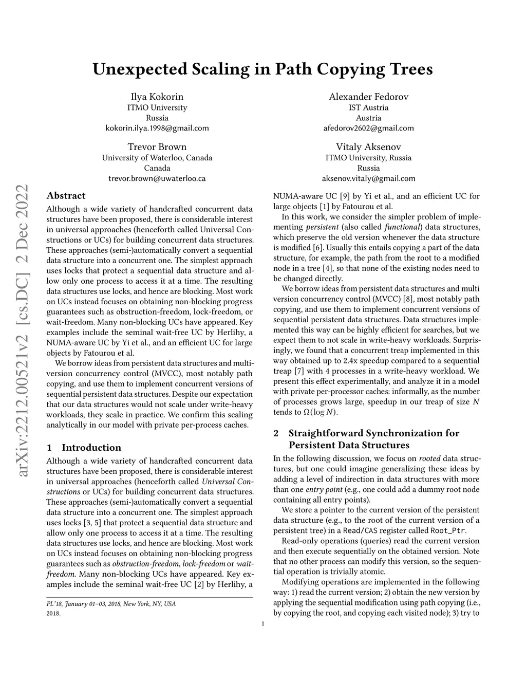 Although a wide variety of handcrafted concurrent data structures have been proposed, there is considerable interest in universal approaches (henceforth called Universal Constructions or UCs) for building concurrent data structures. These approaches (semi-)automatically convert a sequential data structure into a concurrent one. The simplest approach uses locks that protect a sequential data structure and allow only one process to access it at a time. The resulting data structures use locks, and hence are blocking. Most work on UCs instead focuses on obtaining non-blocking progress guarantees such as obstruction-freedom, lock-freedom, or wait-freedom. Many non-blocking UCs have appeared. Key examples include the seminal wait-free UC by Herlihy, a NUMA-aware UC by Yi et al., and an efficient UC for large objects by Fatourou et al. We borrow ideas from persistent data structures and multi-version concurrency control (MVCC), most notably path copying, and use them to implement concurrent versions of sequential persistent data structures. Despite our expectation that our data structures would not scale under write-heavy workloads, they scale in practice. We confirm this scaling analytically in our model with private per-process caches.