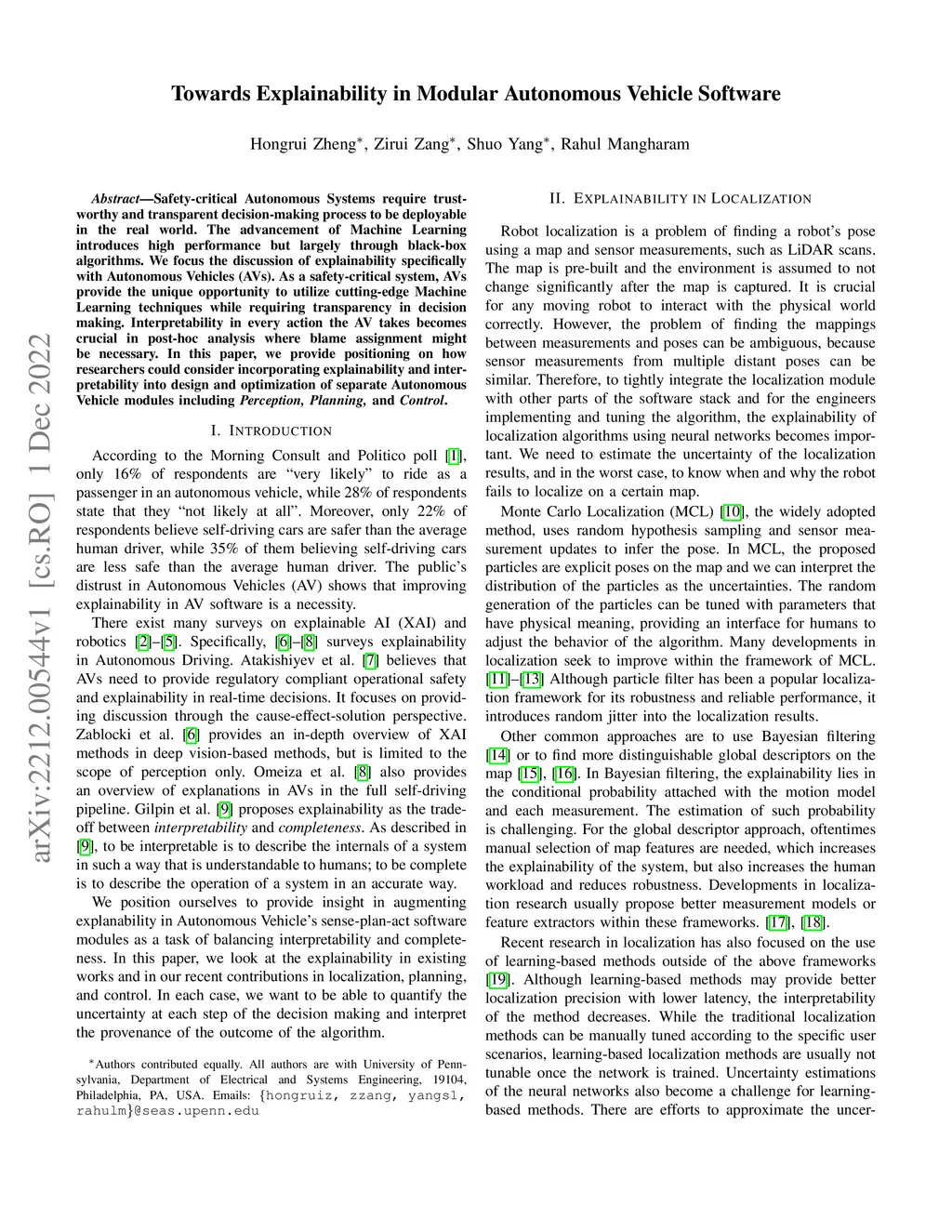 Safety-critical Autonomous Systems require trustworthy and transparent decision-making process to be deployable in the real world. The advancement of Machine Learning introduces high performance but largely through black-box algorithms. We focus the discussion of explainability specifically with Autonomous Vehicles (AVs). As a safety-critical system, AVs provide the unique opportunity to utilize cutting-edge Machine Learning techniques while requiring transparency in decision making. Interpretability in every action the AV takes becomes crucial in post-hoc analysis where blame assignment might be necessary. In this paper, we provide positioning on how researchers could consider incorporating explainability and interpretability into design and optimization of separate Autonomous Vehicle modules including Perception, Planning, and Control.