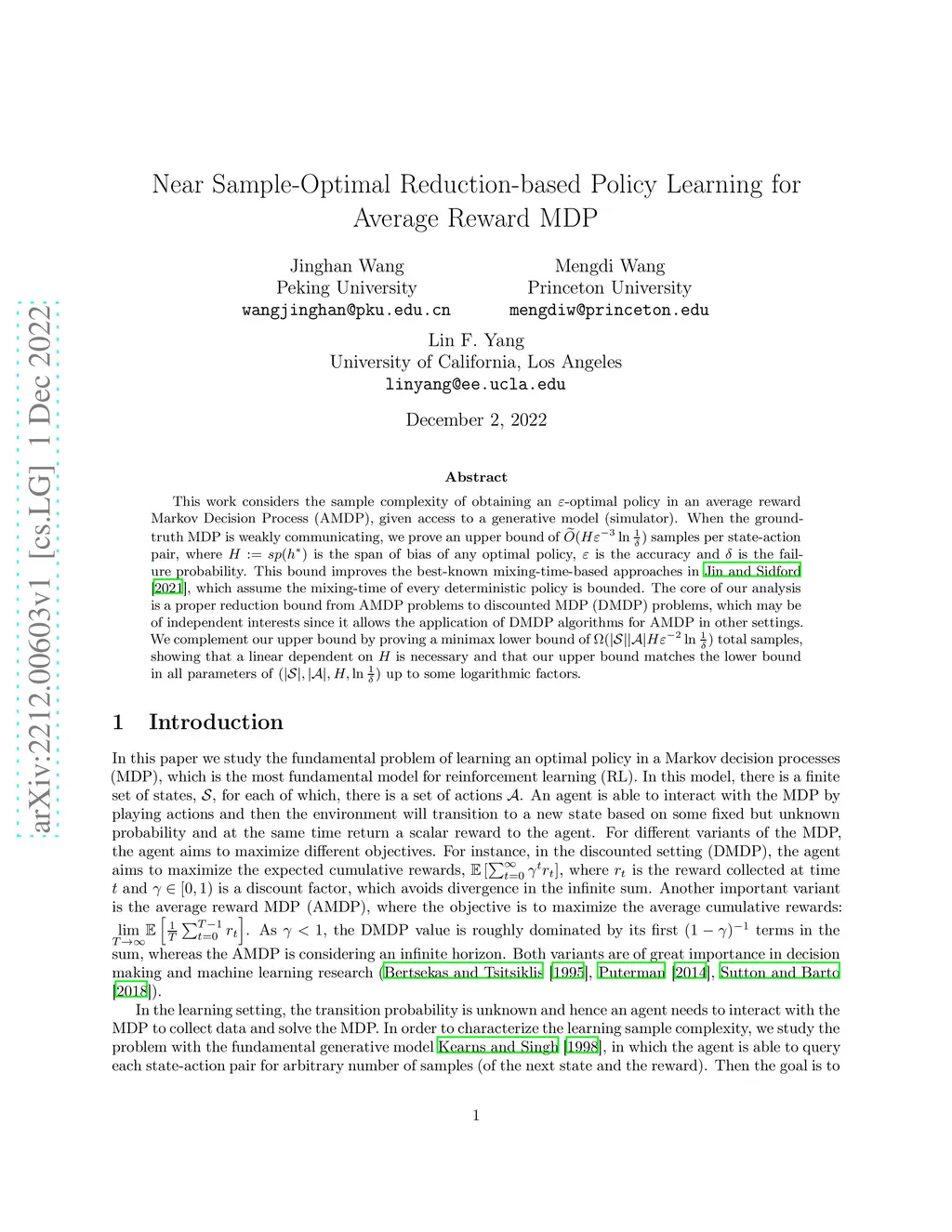 This work considers the sample complexity of obtaining an -optimal policy in an average reward Markov Decision Process (AMDP), given access to a generative model (simulator). When the ground-truth MDP is weakly communicating, we prove an upper bound of samples per state-action pair, where is the span of bias of any optimal policy, is the accuracy and is the failure probability. This bound improves the best-known mixing-time-based approaches in [Jin & Sidford 2021], which assume the mixing-time of every deterministic policy is bounded. The core of our analysis is a proper reduction bound from AMDP problems to discounted MDP (DMDP) problems, which may be of independent interests since it allows the application of DMDP algorithms for AMDP in other settings. We complement our upper bound by proving a minimax lower bound of total samples, showing that a linear dependent on is necessary and that our upper bound matches the lower bound in all parameters of up to some logarithmic factors.