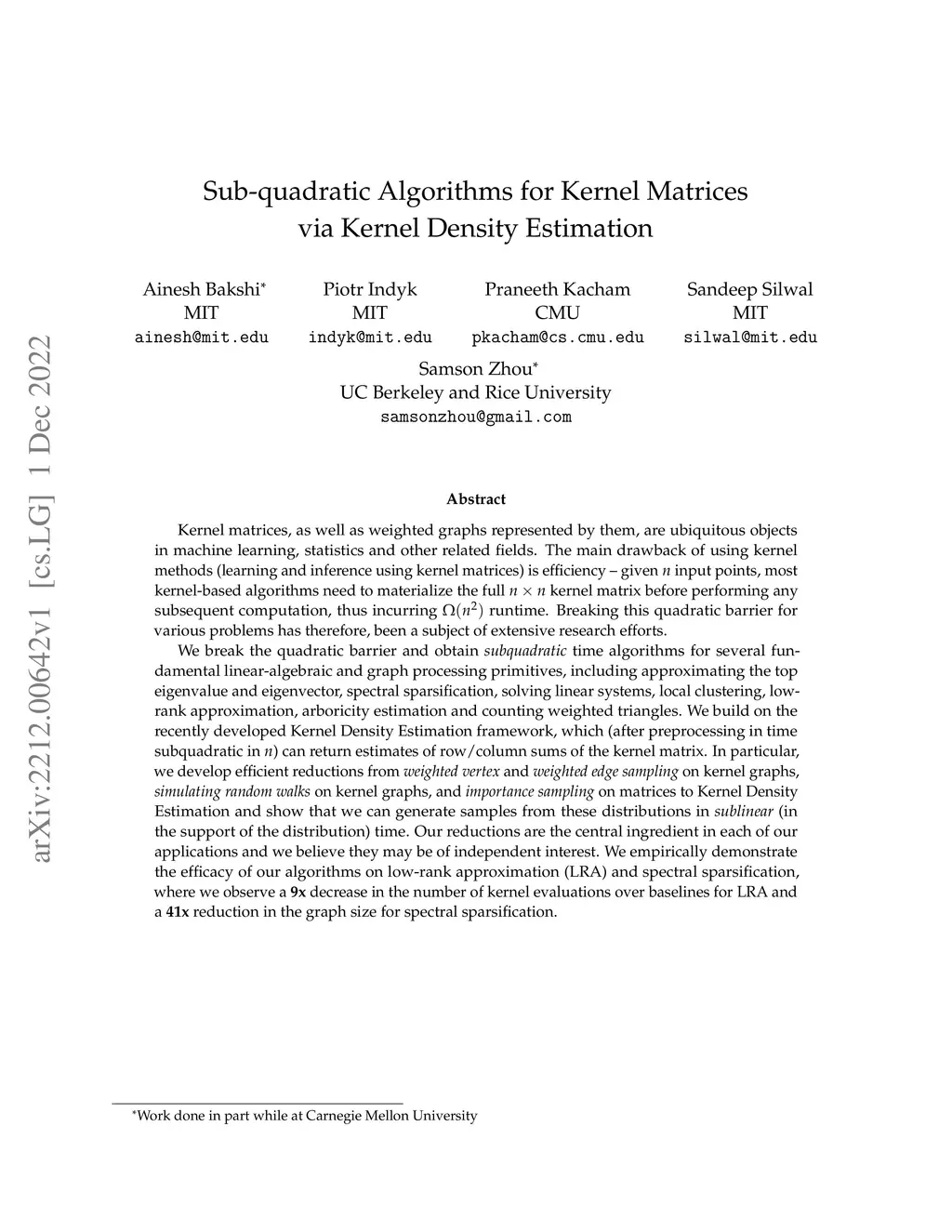 Sub-quadratic Algorithms for Kernel Matrices via Kernel Density