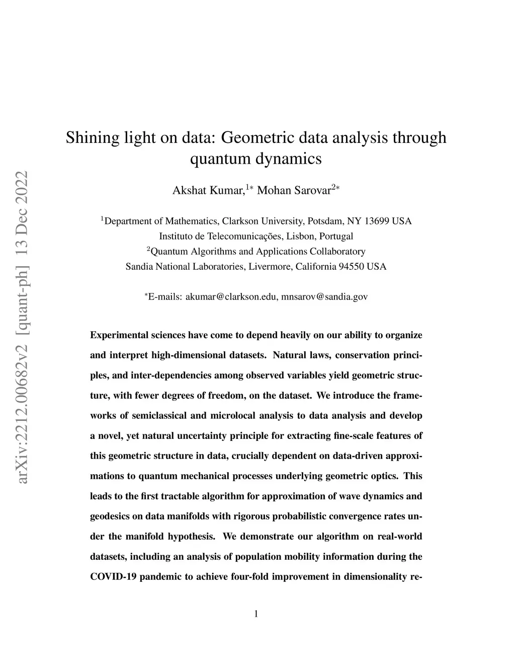 Experimental sciences have come to depend heavily on our ability to organize and interpret high-dimensional datasets. Natural laws, conservation principles, and inter-dependencies among observed variables yield geometric structure, with fewer degrees of freedom, on the dataset. We introduce the frameworks of semiclassical and microlocal analysis to data analysis and develop a novel, yet natural uncertainty principle for extracting fine-scale features of this geometric structure in data, crucially dependent on data-driven approximations to quantum mechanical processes underlying geometric optics. This leads to the first tractable algorithm for approximation of wave dynamics and geodesics on data manifolds with rigorous probabilistic convergence rates under the manifold hypothesis. We demonstrate our algorithm on real-world datasets, including an analysis of population mobility information during the COVID-19 pandemic to achieve four-fold improvement in dimensionality reduction over existing state-of-the-art and reveal anomalous behavior exhibited by less than 1.2% of the entire dataset. Our work initiates the study of data-driven quantum dynamics for analyzing datasets, and we outline several future directions for research.