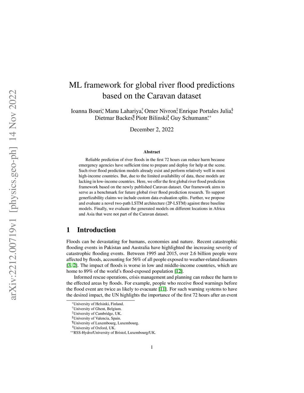 Reliable prediction of river floods in the first 72 hours can reduce harm because emergency agencies have sufficient time to prepare and deploy for help at the scene. Such river flood prediction models already exist and perform relatively well in most high-income countries. But, due to the limited availability of data, these models are lacking in low-income countries. Here, we offer the first global river flood prediction framework based on the newly published Caravan dataset. Our framework aims to serve as a benchmark for future global river flood prediction research. To support generalizability claims we include custom data evaluation splits. Further, we propose and evaluate a novel two-path LSTM architecture (2P-LSTM) against three baseline models. Finally, we evaluate the generated models on different locations in Africa and Asia that were not part of the Caravan dataset.