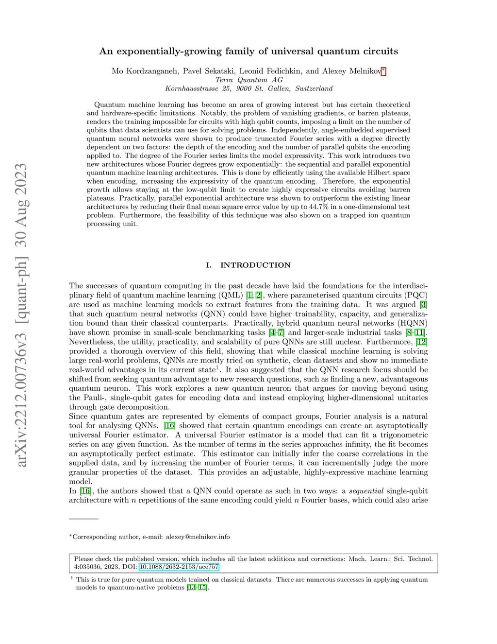 Quantum machine learning has become an area of growing interest but has certain theoretical and hardware-specific limitations. Notably, the problem of vanishing gradients, or barren plateaus, renders the training impossible for circuits with high qubit counts, imposing a limit on the number of qubits that data scientists can use for solving problems. Independently, angle-embedded supervised quantum neural networks were shown to produce truncated Fourier series with a degree directly dependent on two factors: the depth of the encoding and the number of parallel qubits the encoding applied to. The degree of the Fourier series limits the model expressivity. This work introduces two new architectures whose Fourier degrees grow exponentially: the sequential and parallel exponential quantum machine learning architectures. This is done by efficiently using the available Hilbert space when encoding, increasing the expressivity of the quantum encoding. Therefore, the exponential growth allows staying at the low-qubit limit to create highly expressive circuits avoiding barren plateaus. Practically, parallel exponential architecture was shown to outperform the existing linear architectures by reducing their final mean square error value by up to 44.7% in a one-dimensional test problem. Furthermore, the feasibility of this technique was also shown on a trapped ion quantum processing unit.