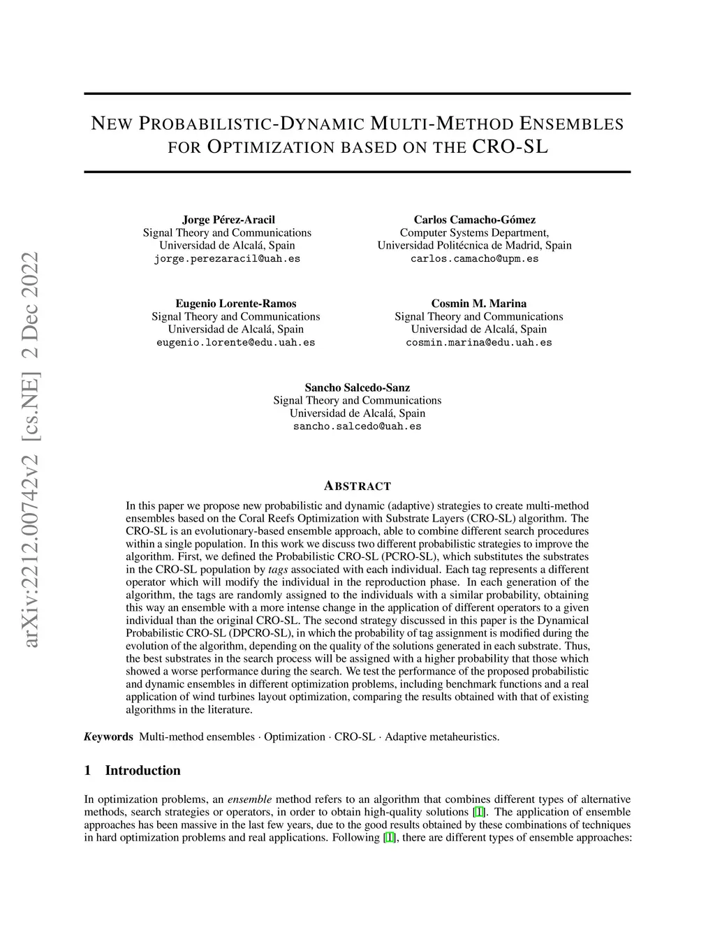 In this paper we propose new probabilistic and dynamic (adaptive) strategies to create multi-method ensembles based on the Coral Reefs Optimization with Substrate Layers (CRO-SL) algorithm. The CRO-SL is an evolutionary-based ensemble approach, able to combine different search procedures within a single population. In this work we discuss two different probabilistic strategies to improve the algorithm. First, we defined the Probabilistic CRO-SL (PCRO-SL), which substitutes the substrates in the CRO-SL population by {\em tags} associated with each individual. Each tag represents a different operator which will modify the individual in the reproduction phase. In each generation of the algorithm, the tags are randomly assigned to the individuals with a similar probability, obtaining this way an ensemble with a more intense change in the application of different operators to a given individual than the original CRO-SL. The second strategy discussed in this paper is the Dynamical Probabilistic CRO-SL (DPCRO-SL), in which the probability of tag assignment is modified during the evolution of the algorithm, depending on the quality of the solutions generated in each substrate. Thus, the best substrates in the search process will be assigned with a higher probability that those which showed a worse performance during the search. We test the performance of the proposed probabilistic and dynamic ensembles in different optimization problems, including benchmark functions and a real application of wind turbines layout optimization, comparing the results obtained with that of existing algorithms in the literature.