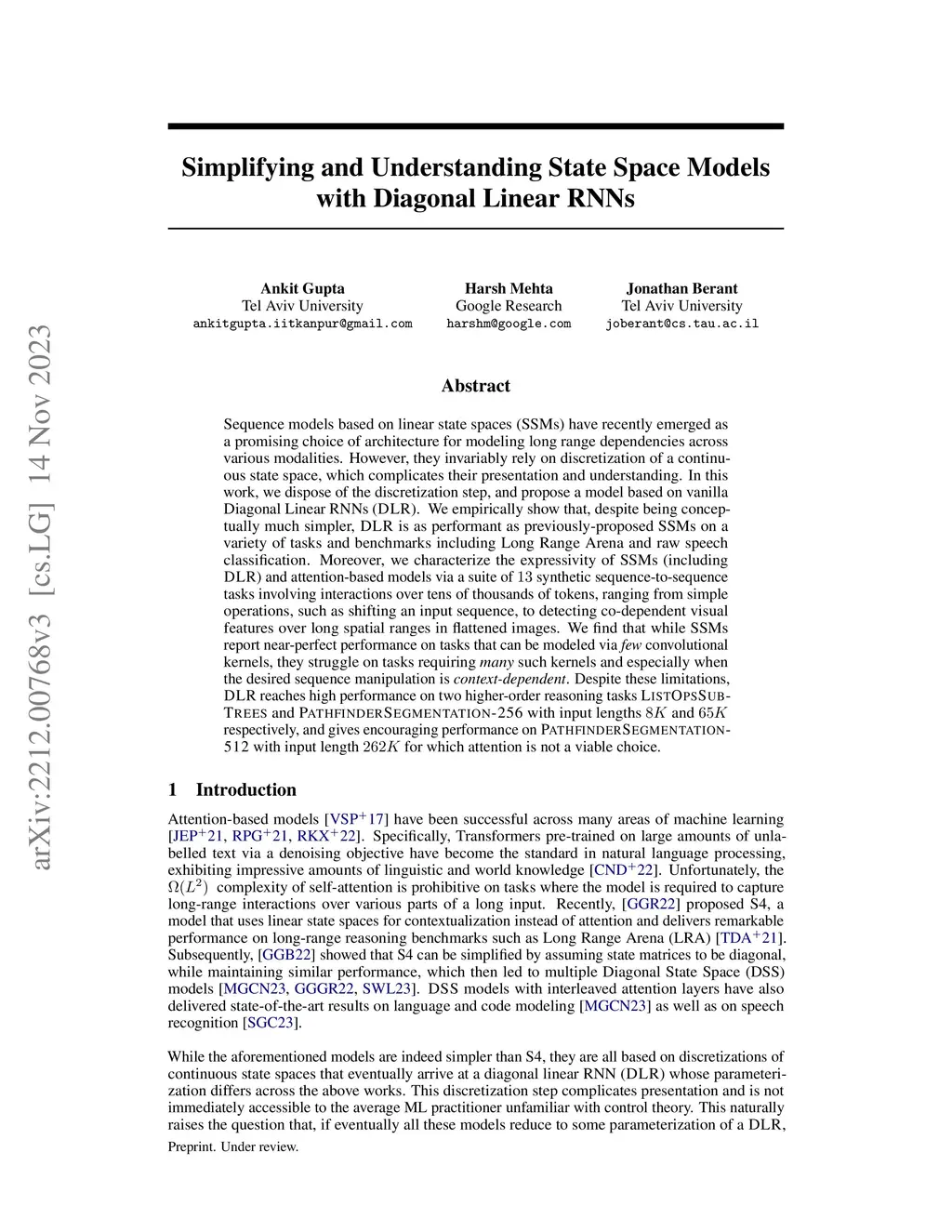 Sequence models based on linear state spaces (SSMs) have recently emerged as a promising choice of architecture for modeling long range dependencies across various modalities. However, they invariably rely on discretization of a continuous state space, which complicates their presentation and understanding. In this work, we dispose of the discretization step, and propose a model based on vanilla Diagonal Linear RNNs (). We empirically show that, despite being conceptually much simpler, is as performant as previously-proposed SSMs on a variety of tasks and benchmarks including Long Range Arena and raw speech classification. Moreover, we characterize the expressivity of SSMs (including ) and attention-based models via a suite of synthetic sequence-to-sequence tasks involving interactions over tens of thousands of tokens, ranging from simple operations, such as shifting an input sequence, to detecting co-dependent visual features over long spatial ranges in flattened images. We find that while SSMs report near-perfect performance on tasks that can be modeled via convolutional kernels, they struggle on tasks requiring such kernels and especially when the desired sequence manipulation is . Despite these limitations, reaches high performance on two higher-order reasoning tasks and with input lengths and respectively, and gives encouraging performance on with input length for which attention is not a viable choice.