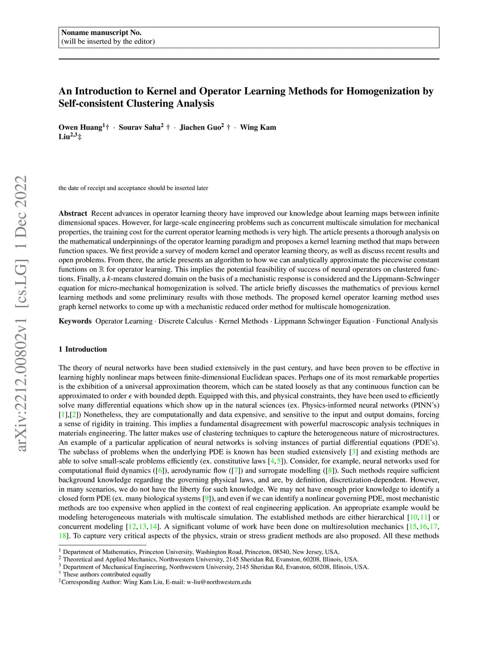 Recent advances in operator learning theory have improved our knowledge about learning maps between infinite dimensional spaces. However, for large-scale engineering problems such as concurrent multiscale simulation for mechanical properties, the training cost for the current operator learning methods is very high. The article presents a thorough analysis on the mathematical underpinnings of the operator learning paradigm and proposes a kernel learning method that maps between function spaces. We first provide a survey of modern kernel and operator learning theory, as well as discuss recent results and open problems. From there, the article presents an algorithm to how we can analytically approximate the piecewise constant functions on R for operator learning. This implies the potential feasibility of success of neural operators on clustered functions. Finally, a k-means clustered domain on the basis of a mechanistic response is considered and the Lippmann-Schwinger equation for micro-mechanical homogenization is solved. The article briefly discusses the mathematics of previous kernel learning methods and some preliminary results with those methods. The proposed kernel operator learning method uses graph kernel networks to come up with a mechanistic reduced order method for multiscale homogenization.