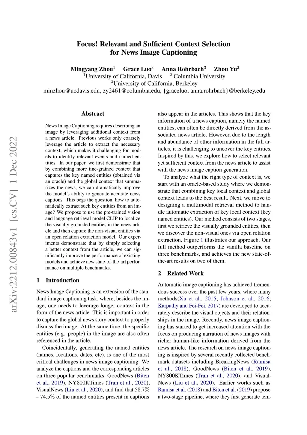 News Image Captioning requires describing an image by leveraging additional context from a news article. Previous works only coarsely leverage the article to extract the necessary context, which makes it challenging for models to identify relevant events and named entities. In our paper, we first demonstrate that by combining more fine-grained context that captures the key named entities (obtained via an oracle) and the global context that summarizes the news, we can dramatically improve the model's ability to generate accurate news captions. This begs the question, how to automatically extract such key entities from an image? We propose to use the pre-trained vision and language retrieval model CLIP to localize the visually grounded entities in the news article and then capture the non-visual entities via an open relation extraction model. Our experiments demonstrate that by simply selecting a better context from the article, we can significantly improve the performance of existing models and achieve new state-of-the-art performance on multiple benchmarks.