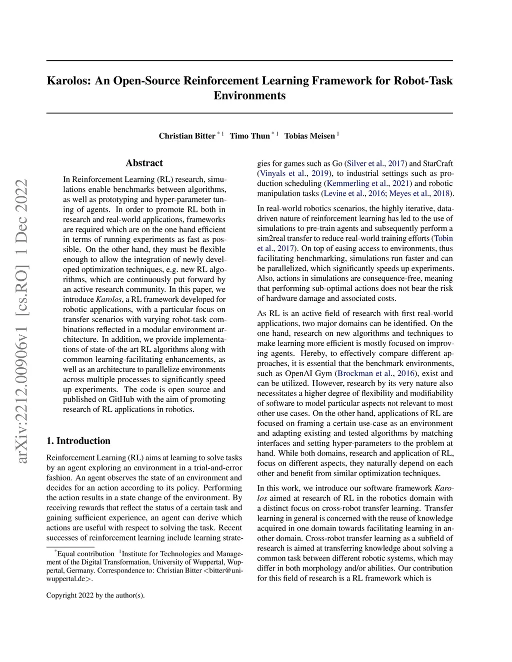 In reinforcement learning (RL) research, simulations enable benchmarks between algorithms, as well as prototyping and hyper-parameter tuning of agents. In order to promote RL both in research and real-world applications, frameworks are required which are on the one hand efficient in terms of running experiments as fast as possible. On the other hand, they must be flexible enough to allow the integration of newly developed optimization techniques, e.g. new RL algorithms, which are continuously put forward by an active research community. In this paper, we introduce Karolos, a RL framework developed for robotic applications, with a particular focus on transfer scenarios with varying robot-task combinations reflected in a modular environment architecture. In addition, we provide implementations of state-of-the-art RL algorithms along with common learning-facilitating enhancements, as well as an architecture to parallelize environments across multiple processes to significantly speed up experiments. The code is open source and published on GitHub with the aim of promoting research of RL applications in robotics.