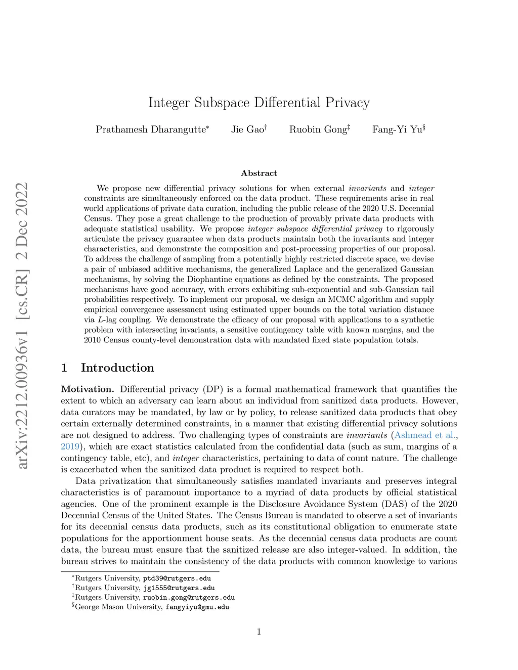 We propose new differential privacy solutions for when external \emph{invariants} and \emph{integer} constraints are simultaneously enforced on the data product. These requirements arise in real world applications of private data curation, including the public release of the 2020 U.S. Decennial Census. They pose a great challenge to the production of provably private data products with adequate statistical usability. We propose \emph{integer subspace differential privacy} to rigorously articulate the privacy guarantee when data products maintain both the invariants and integer characteristics, and demonstrate the composition and post-processing properties of our proposal. To address the challenge of sampling from a potentially highly restricted discrete space, we devise a pair of unbiased additive mechanisms, the generalized Laplace and the generalized Gaussian mechanisms, by solving the Diophantine equations as defined by the constraints. The proposed mechanisms have good accuracy, with errors exhibiting sub-exponential and sub-Gaussian tail probabilities respectively. To implement our proposal, we design an MCMC algorithm and supply empirical convergence assessment using estimated upper bounds on the total variation distance via -lag coupling. We demonstrate the efficacy of our proposal with applications to a synthetic problem with intersecting invariants, a sensitive contingency table with known margins, and the 2010 Census county-level demonstration data with mandated fixed state population totals.