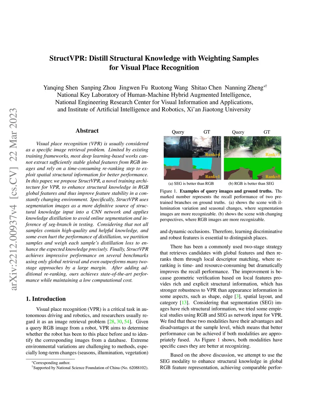 Visual place recognition (VPR) is usually considered as a specific image retrieval problem. Limited by existing training frameworks, most deep learning-based works cannot extract sufficiently stable global features from RGB images and rely on a time-consuming re-ranking step to exploit spatial structural information for better performance. In this paper, we propose StructVPR, a novel training architecture for VPR, to enhance structural knowledge in RGB global features and thus improve feature stability in a constantly changing environment. Specifically, StructVPR uses segmentation images as a more definitive source of structural knowledge input into a CNN network and applies knowledge distillation to avoid online segmentation and inference of seg-branch in testing. Considering that not all samples contain high-quality and helpful knowledge, and some even hurt the performance of distillation, we partition samples and weigh each sample's distillation loss to enhance the expected knowledge precisely. Finally, StructVPR achieves impressive performance on several benchmarks using only global retrieval and even outperforms many two-stage approaches by a large margin. After adding additional re-ranking, ours achieves state-of-the-art performance while maintaining a low computational cost.