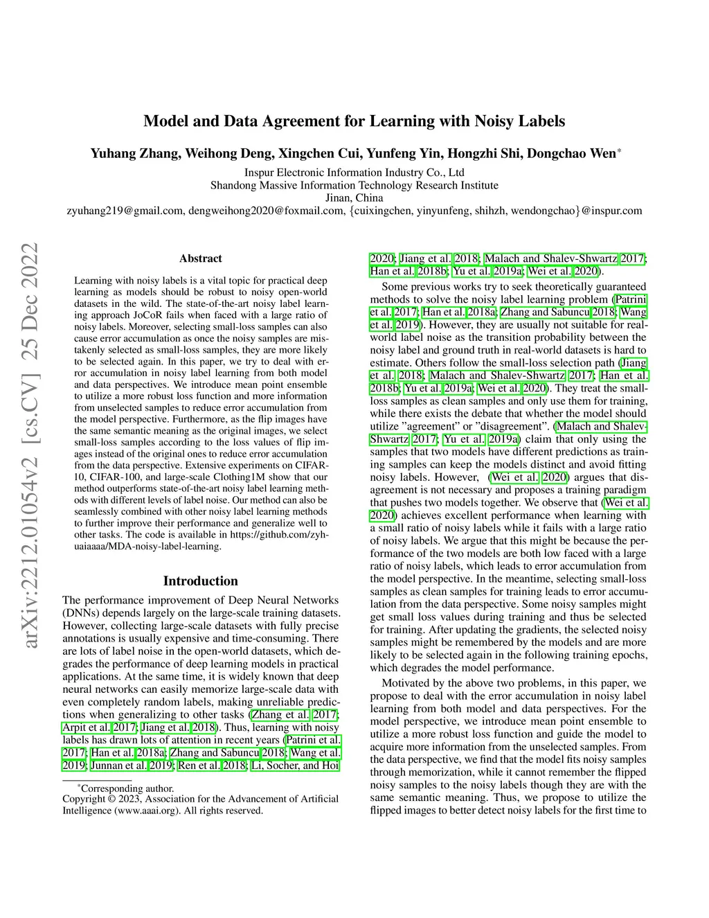 Learning with noisy labels is a vital topic for practical deep learning as models should be robust to noisy open-world datasets in the wild. The state-of-the-art noisy label learning approach JoCoR fails when faced with a large ratio of noisy labels. Moreover, selecting small-loss samples can also cause error accumulation as once the noisy samples are mistakenly selected as small-loss samples, they are more likely to be selected again. In this paper, we try to deal with error accumulation in noisy label learning from both model and data perspectives. We introduce mean point ensemble to utilize a more robust loss function and more information from unselected samples to reduce error accumulation from the model perspective. Furthermore, as the flip images have the same semantic meaning as the original images, we select small-loss samples according to the loss values of flip images instead of the original ones to reduce error accumulation from the data perspective. Extensive experiments on CIFAR-10, CIFAR-100, and large-scale Clothing1M show that our method outperforms state-of-the-art noisy label learning methods with different levels of label noise. Our method can also be seamlessly combined with other noisy label learning methods to further improve their performance and generalize well to other tasks. The code is available in https://github.com/zyh-uaiaaaa/MDA-noisy-label-learning.