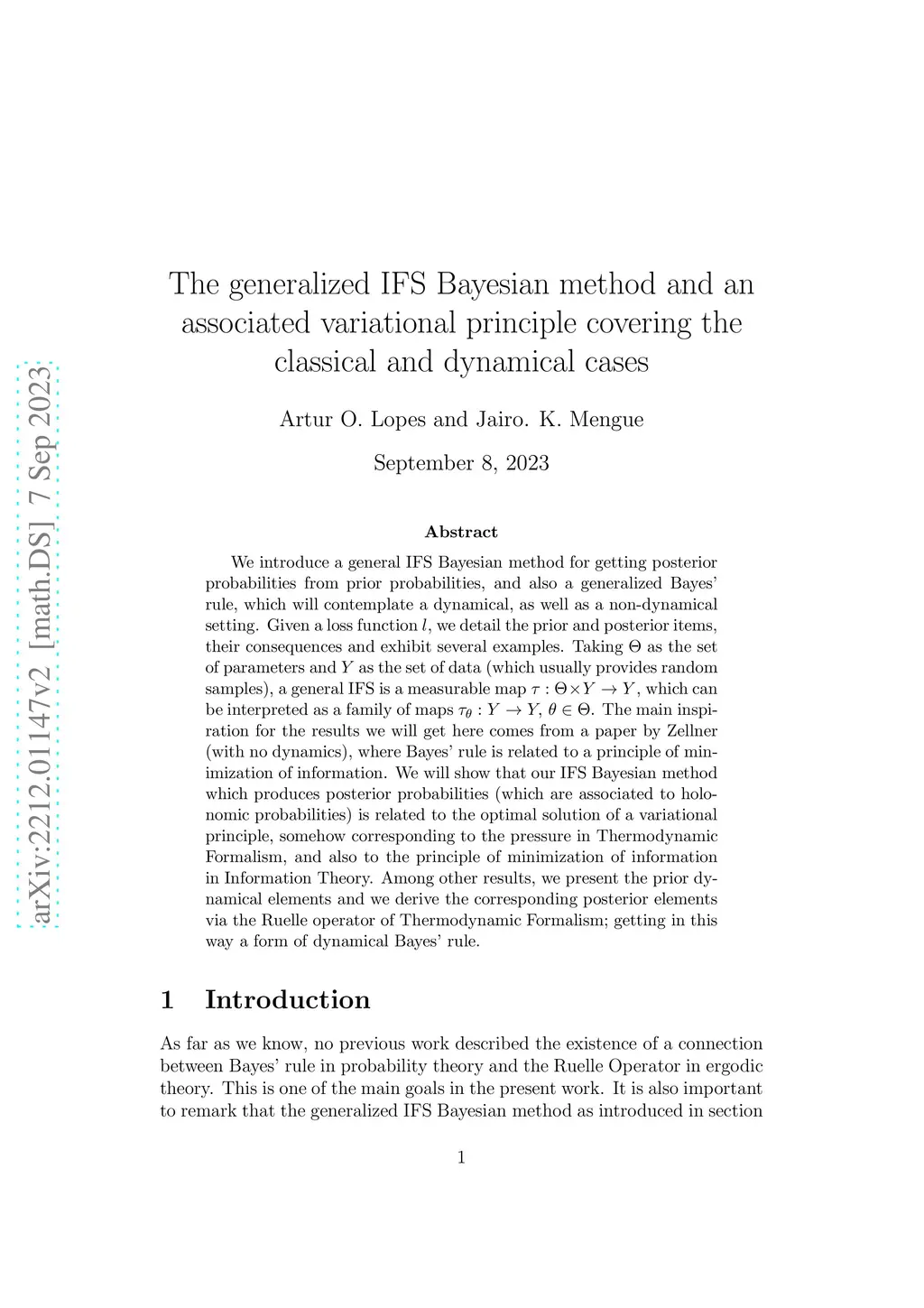 We introduce a general IFS Bayesian method for getting posterior probabilities from prior probabilities, and also a generalized Bayes' rule, which will contemplate a dynamical, as well as a non-dynamical setting. Given a loss function , we detail the prior and posterior items, their consequences and exhibit several examples. Taking as the set of parameters and as the set of data (which usually provides {random samples}), a general IFS is a measurable map , which can be interpreted as a family of maps . The main inspiration for the results we will get here comes from a paper by Zellner (with no dynamics), where Bayes' rule is related to a principle of minimization of {information.} We will show that our IFS Bayesian method which produces posterior probabilities (which are associated to holonomic probabilities) is related to the optimal solution of a variational principle, somehow corresponding to the pressure in Thermodynamic Formalism, and also to the principle of minimization of information in Information Theory. Among other results, we present the prior dynamical elements and we derive the corresponding posterior elements via the Ruelle operator of Thermodynamic Formalism; getting in this way a form of dynamical Bayes' rule.